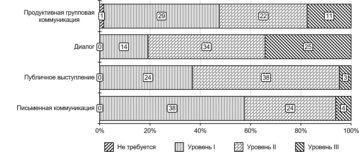 Высказывая требования к коммуникативной компетенции учителя начальных классов, представители общеобразовательных организаций склоняются к тому, что письменная коммуникация реализуется работником либо посредством заполнения готовых бланковых форм, либо посредством создания стандартных продуктов письменной коммуникации. По распределению результатов можно с осторожностью говорить о включении письменной коммуникации в профиль компетенций в соответствии с требованиями уровня I (рис. 5). Однако следует порекомендовать ПОО провести собеседования с представителями работодателей-партнеров, которые могут привести к повышению уровня требований до второго.