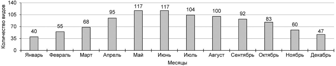В течение наших исследований констатировали изменения видового состава птиц в разные месяцы (рис. 1).