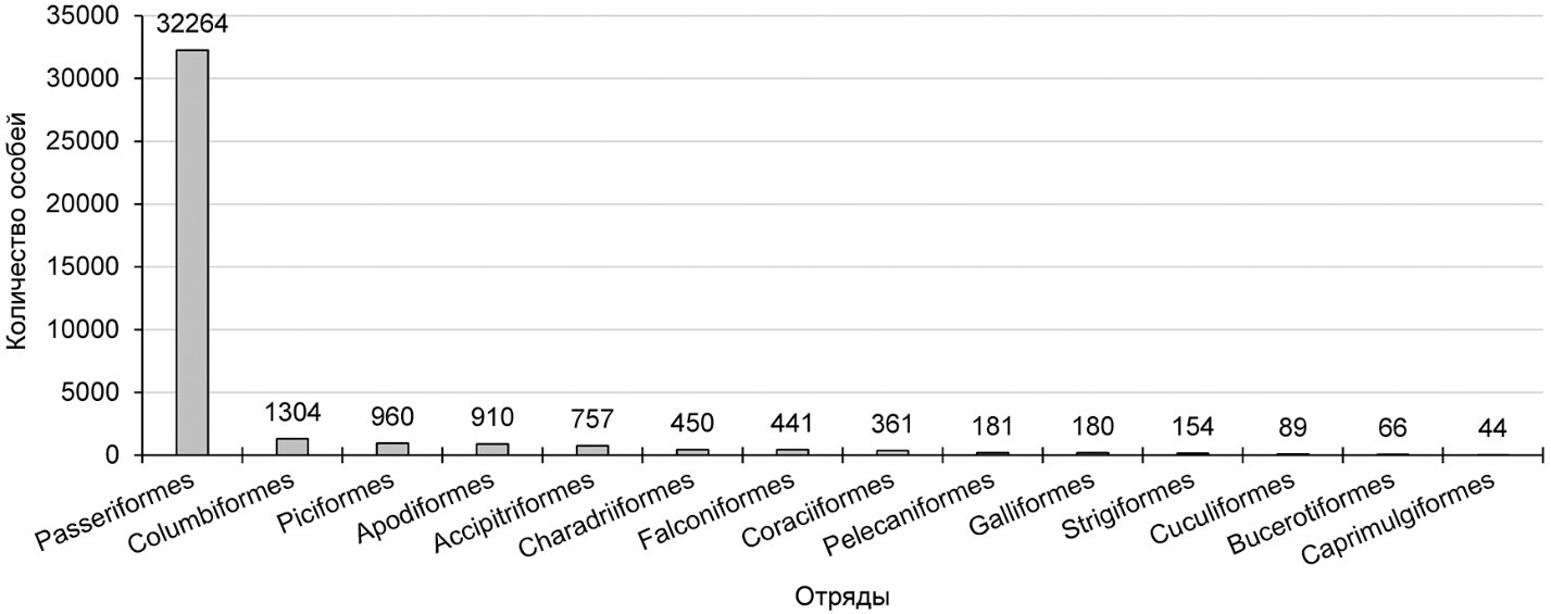 Исходя из наших наблюдений, мы разделили отряды птиц на следующие группы: многочисленные, обычные, малочисленные и редкие [16]. Многочислен отряд воробьинообразных (Passeriformes): из исследованных 38161 особей отряд Passeriformes составил 32264 (84,5%). Обычные – отряды Columbiformes – 1304 особей (3,4%), Piciformes – 960 (2,5%), Apodiformes – 910 (2,4%), Accipitriformes – 757 (2,0%). Малочисленны – отряды Charadriiformes – 450 особей (1,2%), Falconiformes – 441 (1,2%) и Coraciiformes – 361 (0,9%). Редкие – отряды Pelecaniformes – 181 (0,5%), Galliformes – 180 (0,5%), Strigiformes – 154 (0,4%), Cuculiformes – 89 (0,2%), Bucerotiformes – 66 (0,2%), Caprimulgiformes – 44 (0,1%) (рис. 2).