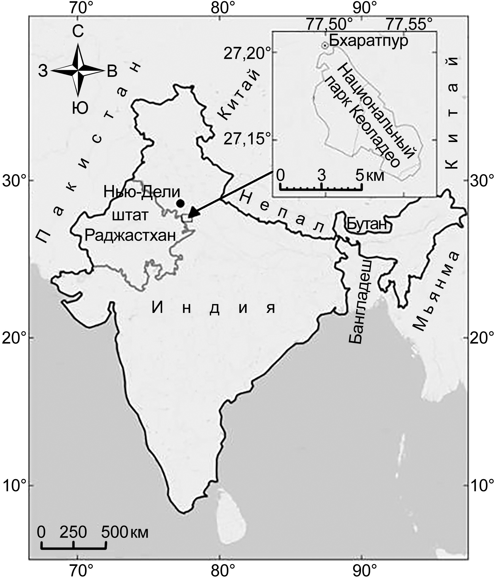 На территории Национального парка Кеоладео (округ Бхаратпур, штат Раджастхан, Индия) (27°7,6′–27°12,2′ с.ш., 77°29,5′–77°33,2′ в.д.) располагаются одни из самых крупных в полупустынной зоне, искусственно созданных пресноводных водно-болотных угодий (ВБУ) международного значения, где зимуют от десятков до сотен тысяч особей водных и околоводных птиц, в том числе до 2001 г. на зимовке отмечались стерхи (Leucogeranus (=Grus) leucogeranus Pallas, 1773) западносибирской популяции [1, с. 24; 2, с. 106, 107, 109] (рис. 1).