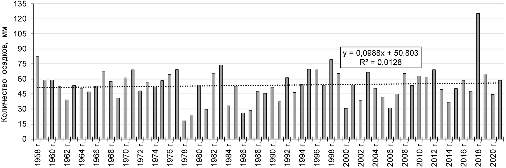 Показатели количества осадков на территории Национального парка Кеоладео в период с 1958 по 2021 гг. претерпевали значительные колебания: среднегодовое количество осадков – с разбросом в 6,9 раза (18,21ₘᵢₙ мм – в 1978 г., 125,42ₘₐₓ мм – в 2018 г.); среднее количество осадков за зимние месяцы – с разбросом по десятилетиям – в 1,01–1,46 раза (45,54ₘᵢₙ мм – в 1980-е гг.; 66,44ₘₐₓ мм – в 2020-е гг.) (рис. 2; табл. 2). Наиболее продолжительный период с пониженным количеством осадков отмечен в 1984–1992 гг. В целом за весь анализируемый период наблюдается статистически не значимая тенденция к увеличению среднегодового количества осадков на 3,39 мм (рис. 2).
