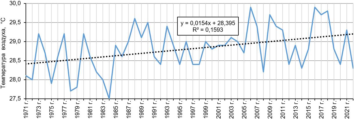 Наибольшая амплитуда варьирования средней максимальной температуры зимних месяцев в период с 1971 по 2022 гг. составила по годам – 1,09 раза (на 2,4°C), по десятилетиям – 1,03 раза (на 0,81°C) (рис. 3; табл. 2). Минимальное значение этого показателя (+27,5°C) отмечено в 1984 г., максимальное (+29,9°C) – в 2006 и 2016 гг. В самый продолжительный относительно стабильный по данному параметру период – в 1999–2003 гг. его колебания не превышали 0,1°C. Наиболее резкое увеличение средней максимальной температуры зимнего периода (на 2,1°C) произошло в период с 1984 по 1988 гг., а наиболее значительное (на 1,7°C) снижение этого показателя – с 2007 по 2008 гг. Однако в целом с 1970-х по 2020-е годы наблюдается тренд к повышению средней максимальной температуры зимних месяцев на 0,3°C. Установлено статистически значимое увеличение данного показателя в 2000-х и 2010-х гг. по сравнению с 1970-ми годами (t = 3,27; p ≤ 0,01 и t = 2,63; p ≤ 0,05), и в 2010-х гг. по сравнению с 1980-ми годами (t = 2,93; p ≤ 0,01).