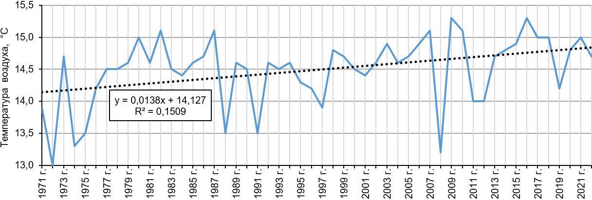 Многолетний тренд к повышению установлен также для хода изменений средней минимальной температуры зимних месяцев в 1971–2022 гг. (рис. 4; табл. 2). Наименьшее значение данного показателя отмечено в 1972 г. (+13,0°C), наибольшее (+15,3°C) – в 2009 и 2016 гг. Разброс значений данного параметра и по годам, и по десятилетиям сопоставим с таковым для средней максимальной температуры зимнего периода – соответственно, в 1,18 раза (на 2,3°C) и 1,06 раза (на 0,81°C). В 1977–1980 гг. отмечается наиболее длительный период увеличения среднегодовой минимальной температуры (в среднем на 0,5°C), затем после 1987 г. – продолжительное снижение этого показателя с минимальным значением (+13,5°C) в 1988 г. и повторным достижением исходного значения 1987 г. (+15,1°C) только в 2007 г. Установлено статистически значимое возрастание средней минимальной температуры в зимний период в 2010-х годах по сравнению с 1970-ми годами (t = 3,43; p ≤ 0,01). В целом с 1971 по 2022 гг. средняя минимальная температура зимнего периода увеличилась на 0,6°C.