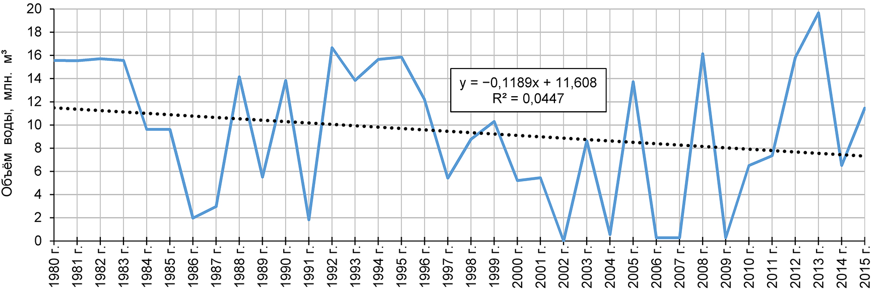 Рисунок 5 – Изменения объёма воды, поступающей в Национальный парк Кеоладео по каналу Гана