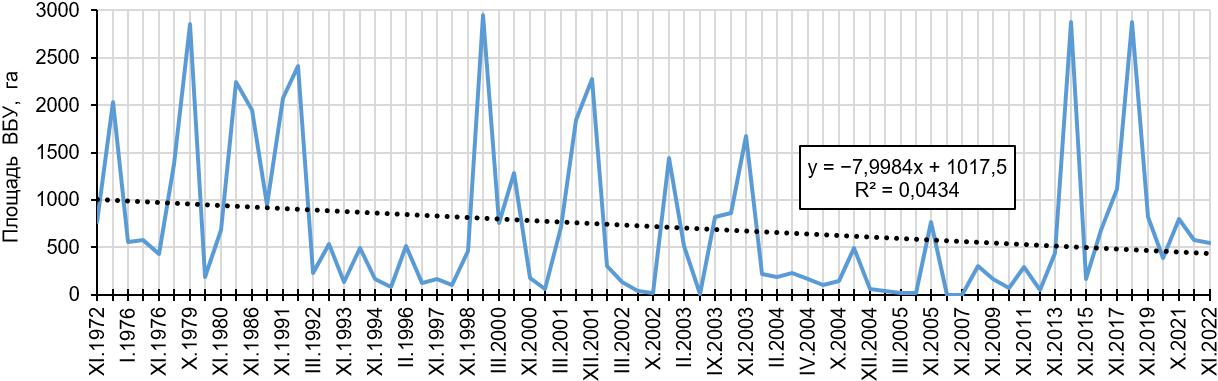 Установлено также, что в период с 1980-х по 2020 годы средняя за десятилетие площадь ВБУ уменьшилась в 12 раз (рис. 6, 7; табл. 3). Несмотря на то, что в отдельные годы (1999, 2014, 2018) анализируемого периода площадь ВБУ достигала уровня 1980-х годов, выявлена общая многолетняя тенденция к уменьшению этого показателя (рис. 6), подтверждаемая достоверно меньшей средней площадью ВБУ парка в 2010-е годы по сравнению с 1990-ми и 2000-ми (соответственно, t = 4,86, p ≤ 0,001; t = 3,65, p ≤ 0,01), в 2020-е годы по сравнению с 2000-ми (t = 8,6, p ≤ 0,01).