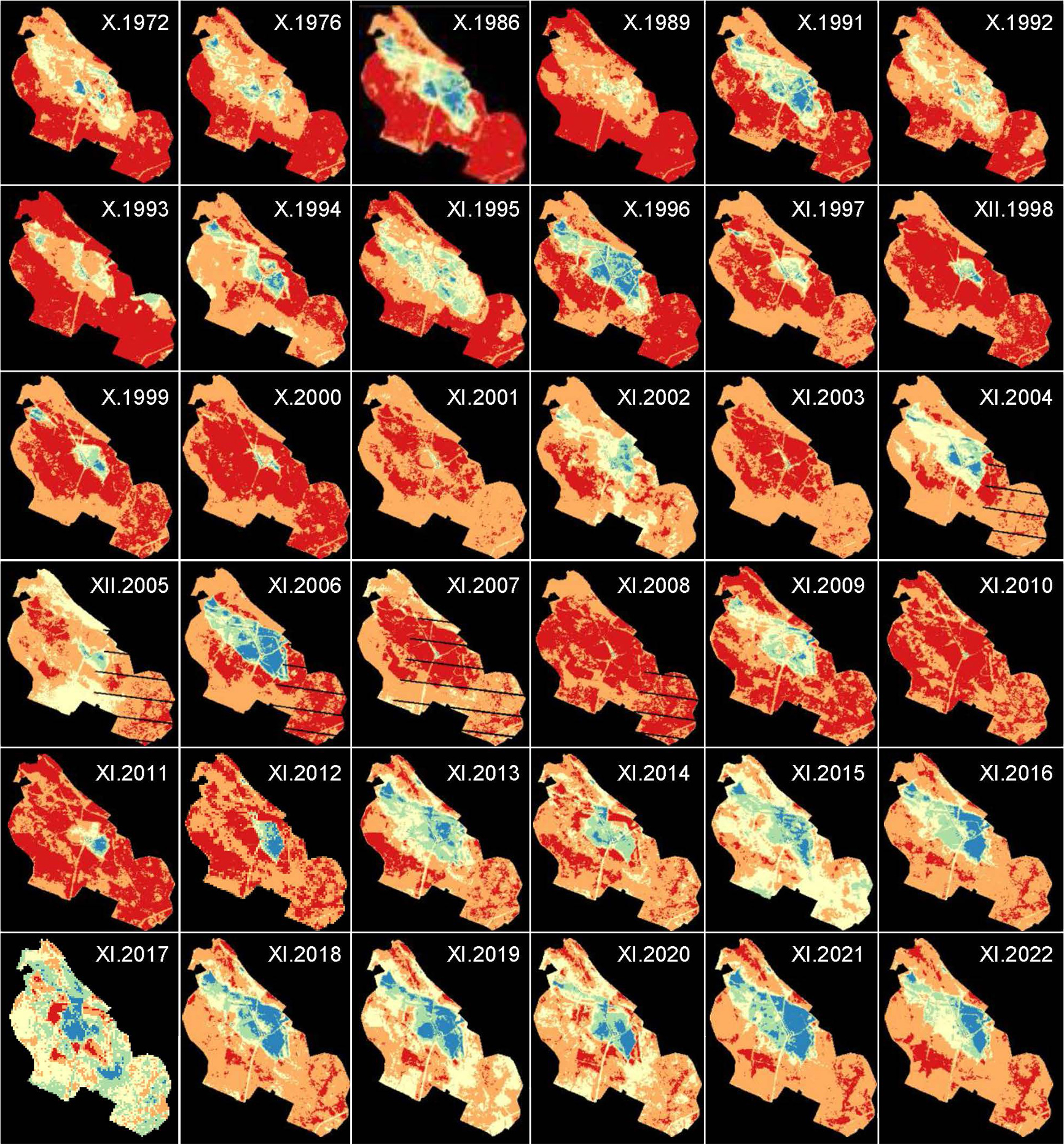 Рисунок 7 – Динамика водно-болотных угодий Национального парка Кеоладео в 1972–2022 гг. (по данным дистанционного зондирования Земли). Красным цветом отображены участки с наименьшим увлажнением (пустыри, участки с древесной растительностью); оранжевым – участки с незначительным увлажнением (луга с преобладанием аридной растительности, кустарниковые заросли); светло-жёлтым – луга с преобладанием гидрофильной растительности; оттенками зелёного цвета – зоны с преобладанием водно-болотной растительности, или участки поверхности с высокой влажностью (мелководья, отмели); синим – участки открытой воды