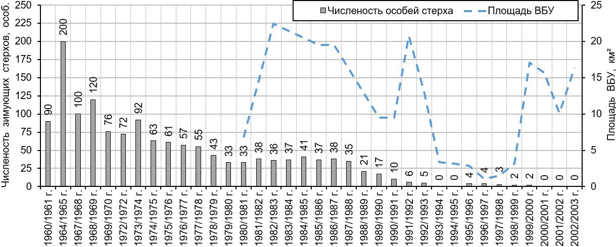 Однако для территории Национального парка Кеоладео, начиная с 1978 г. отмечаются частые засухи (рис. 2). По данным ДЗЗ видно, что именно мелководные местообитания (сырые луга с гидрофильной растительностью и водно-болотная растительность) в Кеоладео претерпевали по десятилетиям самые значительные колебания, площадь ВБУ – самое значительное сокращение (рис. 7; табл. 4). Обсуждаемые изменения ландшафтной структуры ВБУ Национального парка Кеоладео согласуются с сокращением количества стерхов на зимовке (рис. 8) [2, с. 106–107; 16, p. 43].