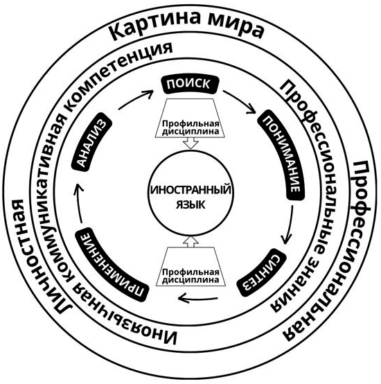 Резюмируя вышеизложенное, можно сделать вывод, что междисциплинарный подход к обучению иностранному языку осуществляется через опору иностранного языка на профильные дисциплины с целью установления значимых, с точки зрения обучающихся, связей между дисциплинами для формирования иноязычной коммуникативной компетенции и совершенствования профессиональных знаний посредством языка, а именно умения находить, понимать, синтезировать и использовать знания профильных дисциплин через английский язык и на языке, расширяя профессиональную и личностную картины мира (рис. 1).