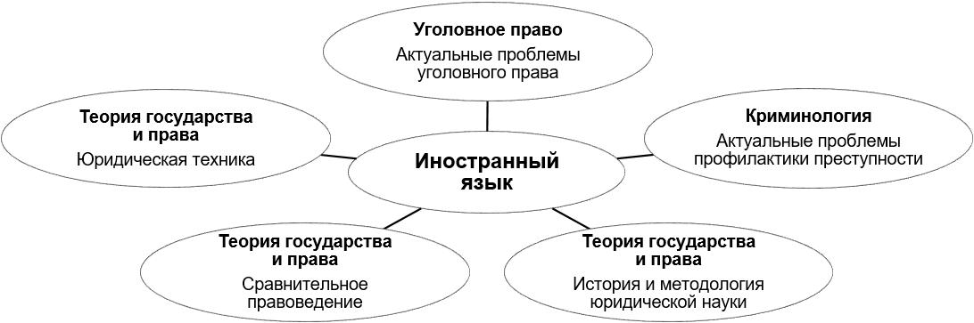 Тематический план коррелирует с пятью дисциплинами учебного плана: актуальные проблемы уголовного права, юридическая техника, история и методология юридической науки, сравнительное правоведение, актуальные проблемы профилактики преступности. Обобщенная структурная модель междисциплинарных связей представлена на рис. 2.