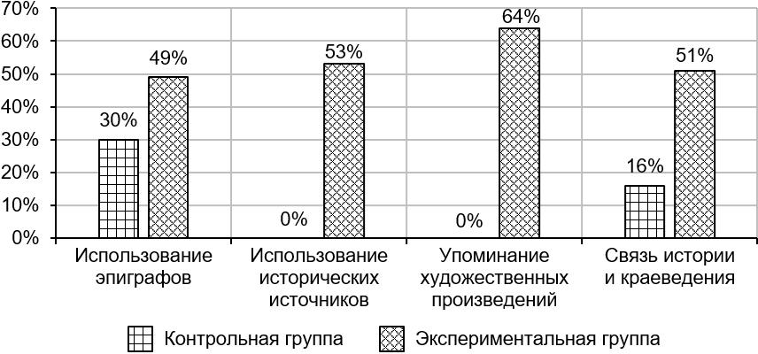 Цель данного задания заключалась в сравнении информативности и разнообразности излагаемой в эссе информации. При проверке обращалось внимание на использование эпиграфов, отрывков из источников (нормативно-правовые акты, мемуарная литература и т.д.), отрывков из художественных произведений, связь знаний по истории и краеведению. Исходя из проверенных работ, был сделан вывод, что в экспериментальной группе большинство обучающихся использовали эпиграфы, упоминали источники по рассматриваемой теме и анализировали события Отечественной войны 1812 года с событиями, которые происходили в это время в Самаре. Разнообразность привлекаемых материалов связана с тем, что просмотренный на уроке фильм включал в себя все вышеупомянутые критерии. В контрольной группе некоторые обучающиеся использовали эпиграф, остальная информация же являлась пересказом изложенного материала в учебнике (рисунок 2).
