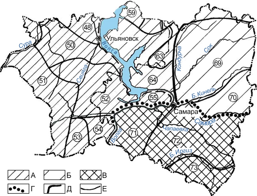 Рисунок 1 – Физико-географические районы Самаро-Ульяновского Поволжья (по [1]): А – лесостепная провинция Предволжья, Б – лесостепная провинция Заволжья, В – степная провинция Заволжья, Г – граница физико-географических зон, Д – граница физико-географических провинций, Е – граница физико-географических районов. Физико-географические районы: 48 – Средне-Свияжский, 50 – Корсунско-Сенгилеевский, 51 – Инзенский, 52 – Свияго-Усинский, 54 – Южно-Сызранский, 55 – Жигулевский, 64 – Мелекесско-Ставропольский, 69 – Сокский, 70 – Самаро-Кинельский, 71 – Чагринский, 72 – Сыртовый, 73 – Иргизский