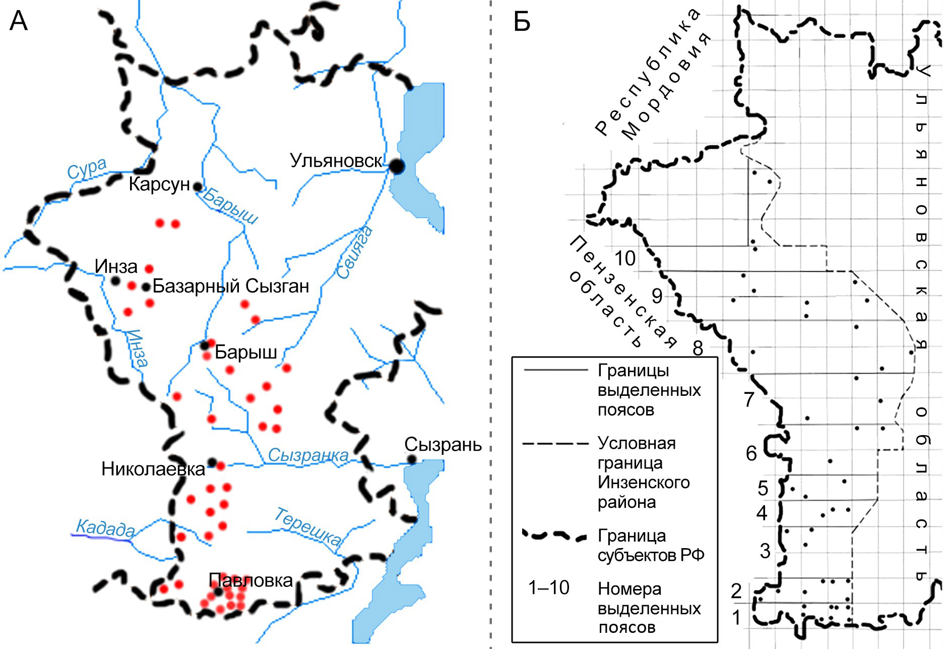 Рисунок 2 – Расположение флористических описаний (А) и выделенных поясов (Б) на территории Инзенского физико-географического района. Площадь каждого квадрата, составляющего сеть, соответствует 100 км²