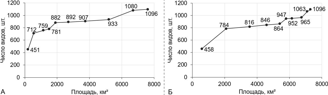 Рисунок 3 – Зависимость числа видов от приращения площади по направлению с юга на север (А) и с севера на юг (Б). Числа на кривой показывают число видов, отмеченных на соответствующей площади