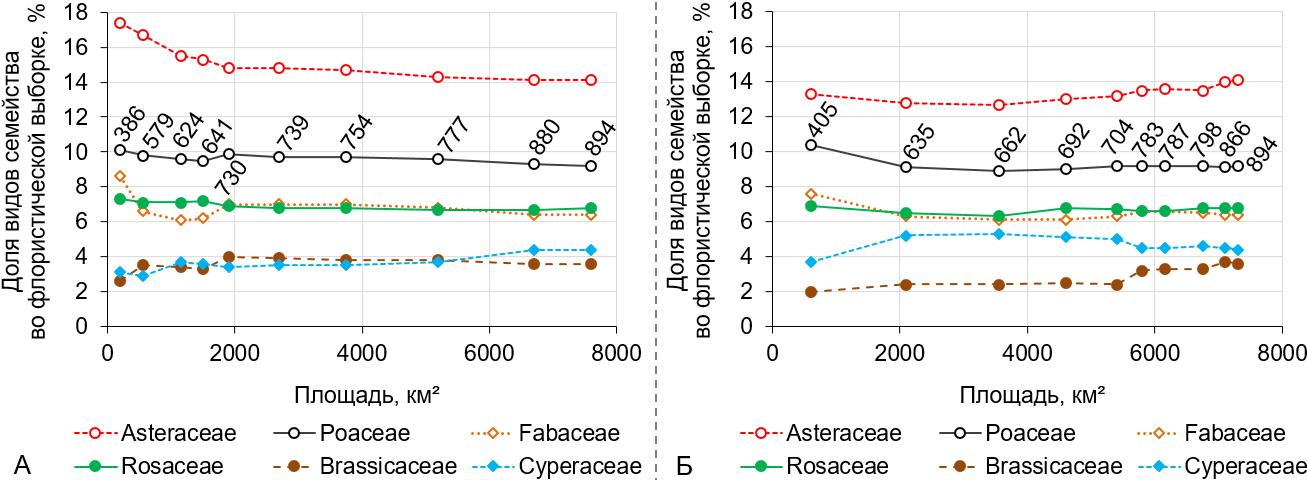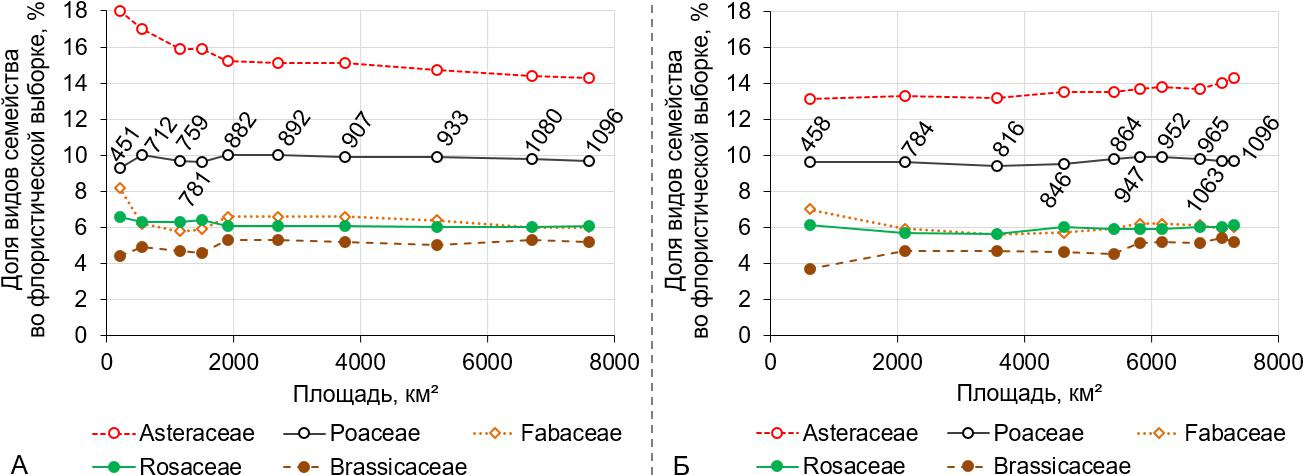 Рисунок 4 – Изменение доли ведущих семейств в ряду флористических выборок в зависимости от приращения площади в широтном направлении (с юга на север (А) и севера на юг (Б)). Числа на кривой показывают число видов, отмеченных на соответствующей площади
