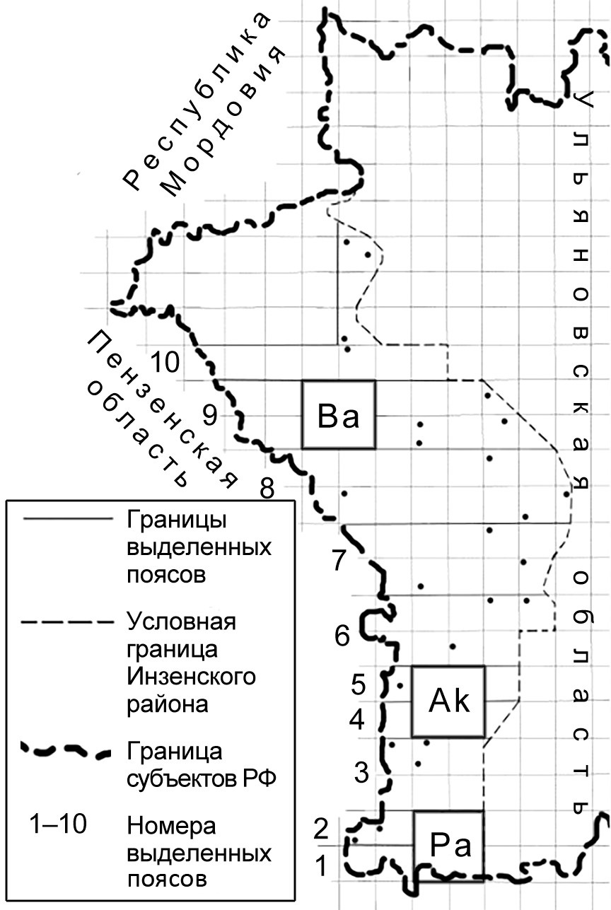 Рисунок 6 – Расположение выделенных локальных флор на территории Инзенского района: Ba – Базарносызганская, Ak – Акуловская, Pa – Павловская
