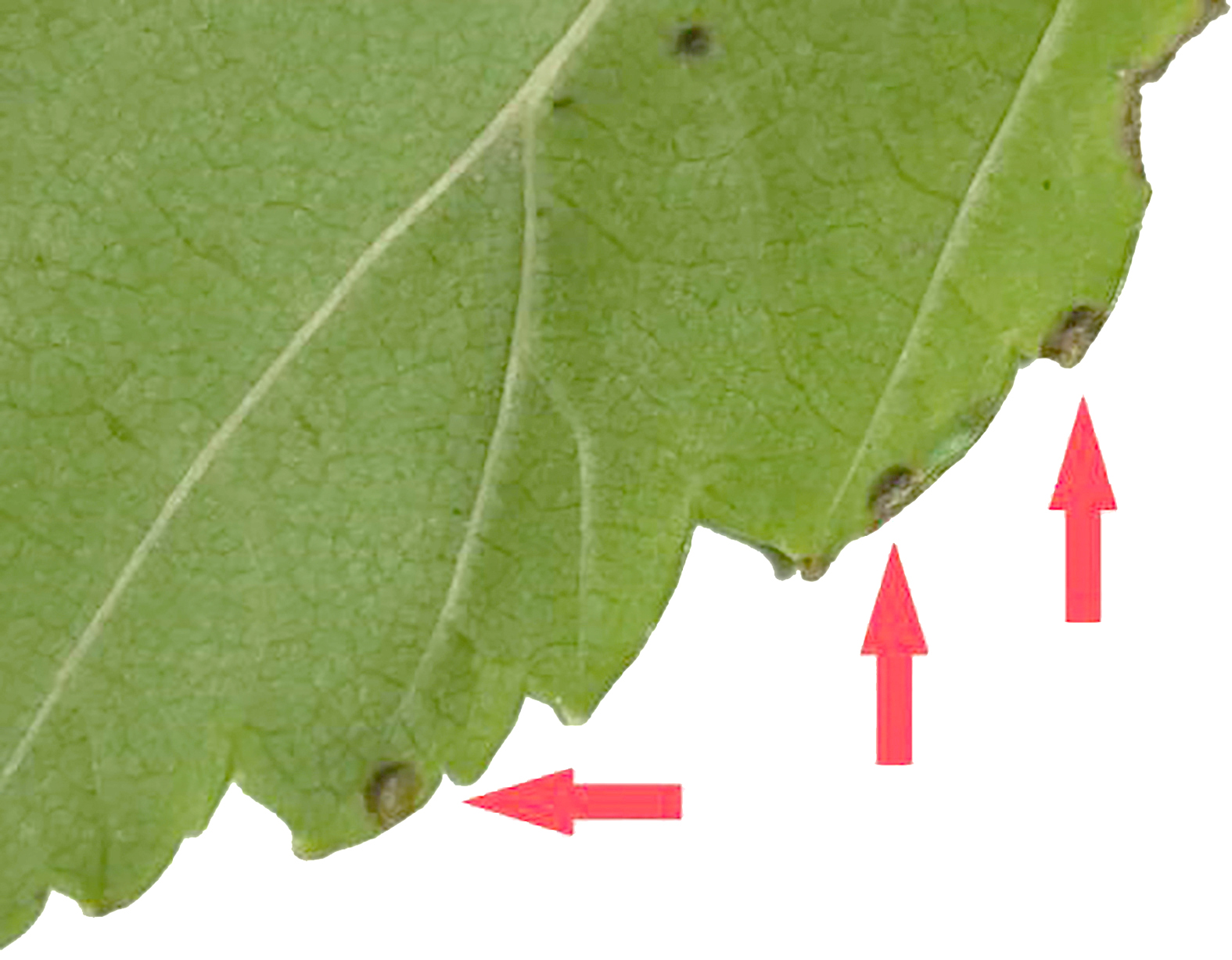 Рисунок 1 – Яйца пилильщика-зигзага на зубцах листа вяза голого (фото А.М. Кондратьевой)