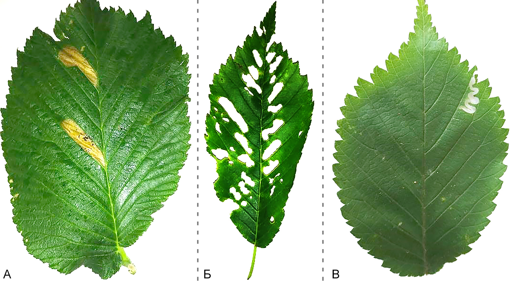Рисунок 2 – Повреждение листьев вяза пилильщиками: А – мины F. ulmi; Б – объедание личинками C. ulmi; В – объедание молодой личинкой A. leucopoda (фото А.М. Кондратьевой)