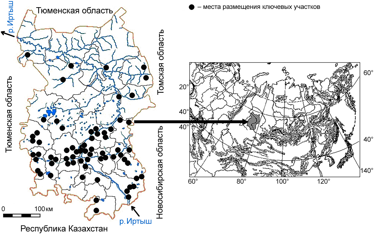 Обследовались биотопы в Называевском районе (окрест. сёл Князево, Нововоскресенка, Лорис-Меликово, г. Называевск), Саргатском (окрест. п.г.т. Саргатское, д. Верблюжье, сёл Баженово, Увальная Бития), Исилькульском (окрест. г. Исилькуль, сёл Украинка, Медвежье, Маргенау, деревень Лесной, Новодонка), Москаленском (окрест. п.г.т. Москаленки, с. Тумановка, д. Спартак), Марьяновском (окрест. п.г.т. Марьяновка, сёл Новая Шараповка, Орловка, пос. Конезаводский), Любинском (окрест. с. Любино-Малороссы, ст. Новокиевская, пос. Политотдел, пос. Камышловский, п.г.т. Красный Яр), Омском (окрест. сёл Красноярка, Давыдовка, Подгородка, Чернолучье, Петровка, Ребровка, пос. Ключи, пос. Новоомский и г. Омск), Горьковском (окрест. сёл Исаковка, Серебряное, Лежанка, д. Алексеевка, п.г.т. Горьковское), Нижнеомском (окрест. д. Радищево, с. Пустынное), Кормиловском (окрест. ст. Сыропятское, д. Корниловка, сёл Георгиевка, Алексеевка, п.г.т. Кормиловка) и Калачинском (окрест. сёл Осокино, Воскресенка, Орловка и г. Калачинск), с общей площадью центральной лесостепи ~26686 км².