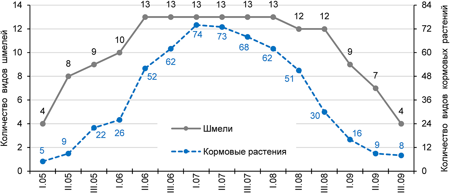 В течение всего лётного периода шмелей наблюдалось изменение количества кормовых растений. От минимального (5 видов) на начало периода лётной активности – в I декаде мая, до максимального (74 вида) в основной период лётной активности – в I декаде июля. Далее происходит снижение до минимального (8 видов), что было зафиксировано в III декаде сентября (рис. 2).