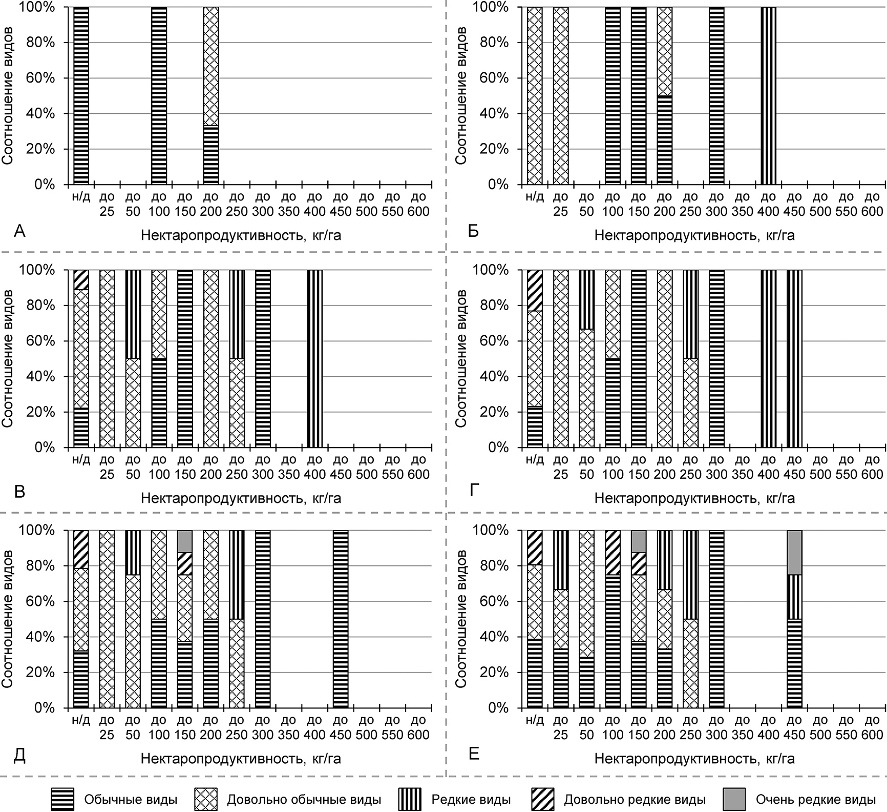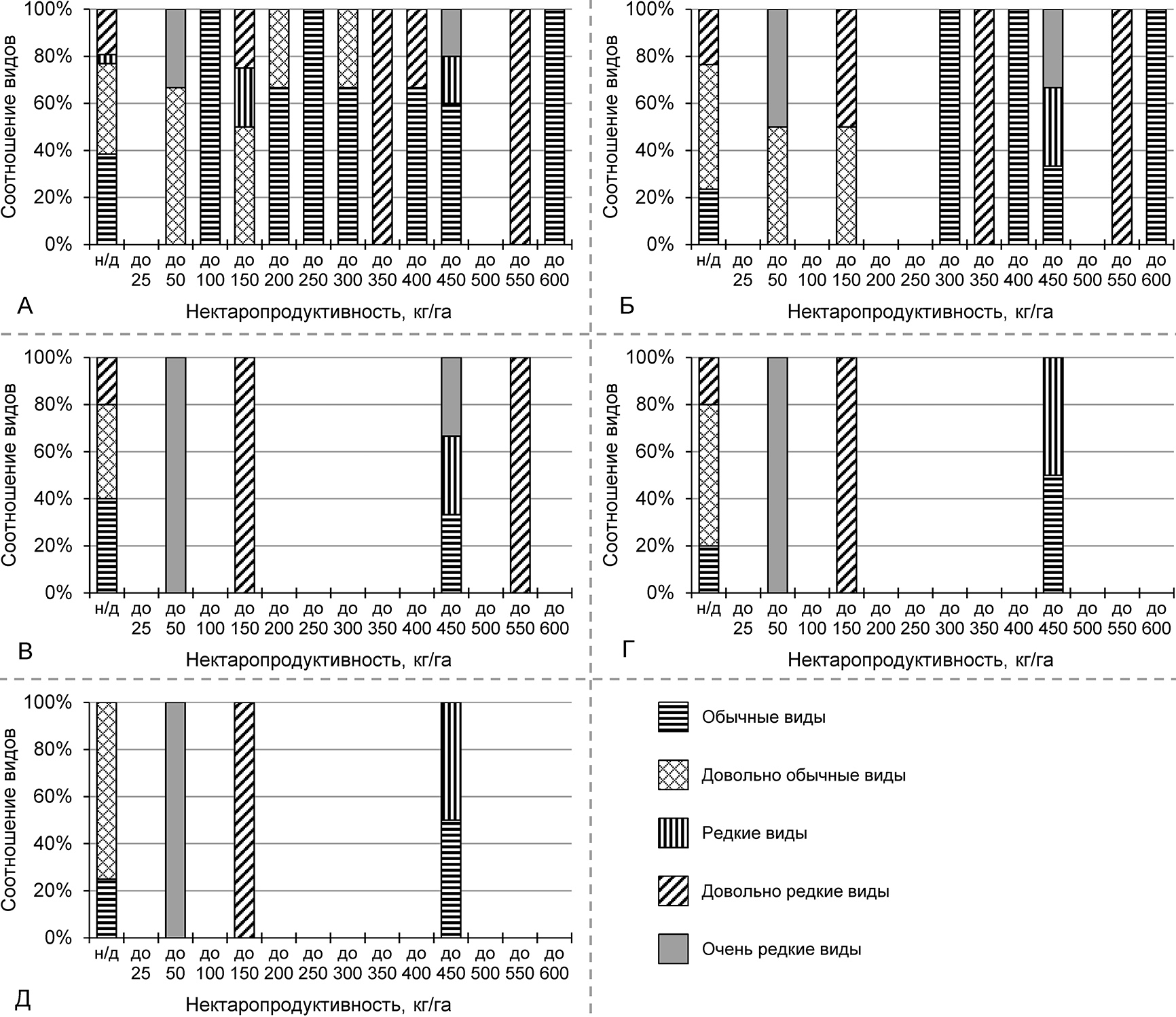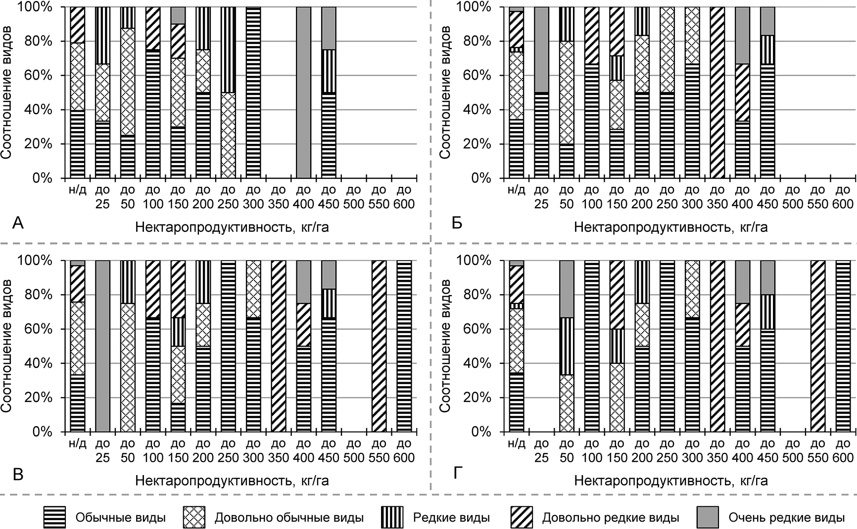Таким образом, обычные и довольно обычные виды растений с нектаропродуктивностью от 50,0 кг/га являются основными кормовыми объектами шмелей межвидовой ассоциации центральной лесостепи Омской области. Все виды с нектаропродуктивностью до 50,0 кг/га и все редкие, довольно редкие и очень редкие виды, по причине низкой нектаропродуктивности в первом случае и редкости во втором, полноценно не обеспечивают кормовые потребности шмелей, поэтому являются поддерживающими кормовыми растениями.