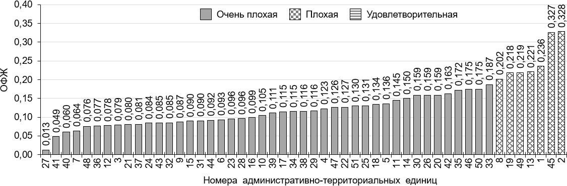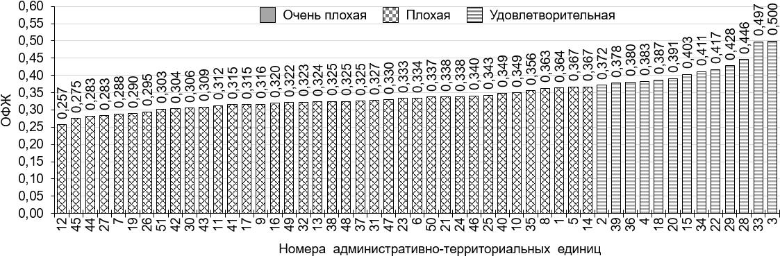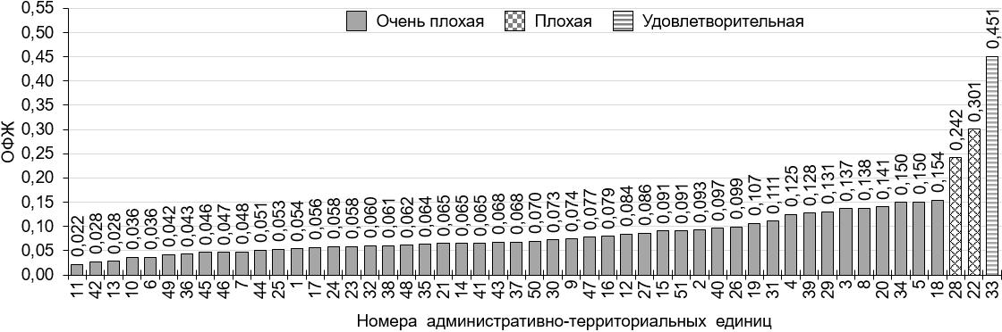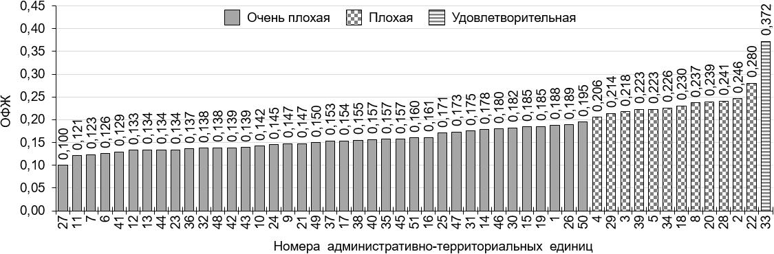 Рисунок 1 – Рейтинг административно-территориальных единиц Нижегородской области по социо-эколого-экономическому состоянию, построенный по усредненным значениям ОФЖ за 2010–2020 гг. СЭЭС расположены в порядке возрастания ОФЖ и разделены на группы в зависимости от ее значений («очень плохая», «плохая», «удовлетворительная» характеристика СЭЭС). Административно-территориальные единицы (данные условные обозначения используются также на рисунках 2–4): 1 – Ардатовский р-н; 2 – г. Арзамас; 3 – Арзамасский р-н; 4 – Балахнинский р-н; 5 – Богородский р-н; 6 – Большеболдинский р-н; 7 – Большемурашкинский р-н; 8 – г. Бор; 9 – Бутурлинский р-н; 10 – Вадский р-н; 11 – Варнавинский р-н; 12 – Вачский р-н; 13 – Ветлужский р-н; 14 – Вознесенский р-н; 15 – Володарский р-н; 16 – Воротынский р-н; 17 – Воскресенский р-н; 18 – г. Выкса; 19 – Гагинский р-н; 20 – Городецкий р-н; 21 – Дальнеконстантиновский р-н; 22 – г. Дзержинск; 23 – Дивеевский р-н; 24 – Княгининский р-н; 25 – Ковернинский р-н; 26 – Краснобаковский р-н; 27 – Краснооктябрьский р-н; 28 – Кстовский р-н; 29 – Кулебакский р-н / г. Кулебаки; 30 – Лукояновский р-н; 31 – Лысковский р-н; 32 – Навашинский р-н; 33 – г. Нижний Новгород; 34 – Павловский р-н; 35 – Первомайский р-н / г. Первомайск; 36 – Перевозский р-н; 37 – Пильнинский р-н; 38 – Починковский р-н; 39 – Семеновский р-н; 40 – Сергачский р-н; 41 – Сеченовский р-н; 42 – Сокольский р-н; 43 – Сосновский р-н; 44 – Спасский р-н; 45 – Тонкинский р-н; 46 – Тоншаевский р-н; 47 – Уренский р-н; 48 – Чкаловский р-н / г. Чкаловск; 49 – Шарангский р-н; 50 – Шатковский р-н; 51 – г. Шахунья