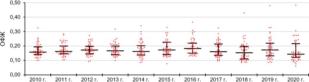 Если оценивать динамику изменения показателей ОФЖ в административно-территориальных единицах региона за период изучаемого десятилетия, то, согласно критерию Фридмана, выявляются статистически значимые изменения (χ² = 58,89; p = 5,88 × 10⁻⁹). Графическое отображение результатов представлено на рис. 5.
