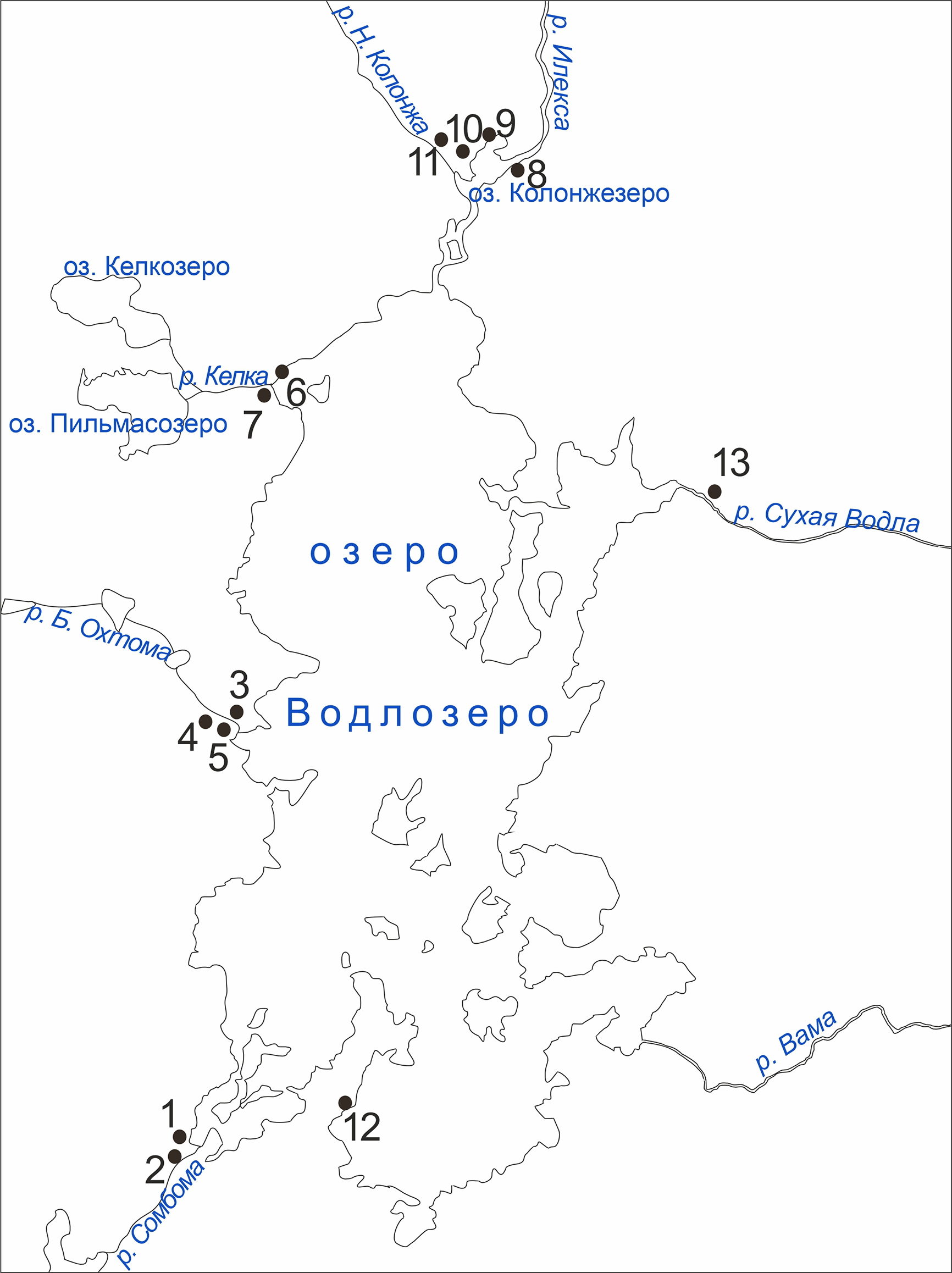 Рисунок 1 – Поселения с керамикой «каргопольского типа». 1, 2 – Сомбома I–II; 3–5 – Охтома I–III; 6, 7 – Келка I, III; 8, 9 – Илекса III, IV; 10, 11 – Шеттима I, II; 12 – Кевасалма; 13 – Водла V на озере Водлозеро