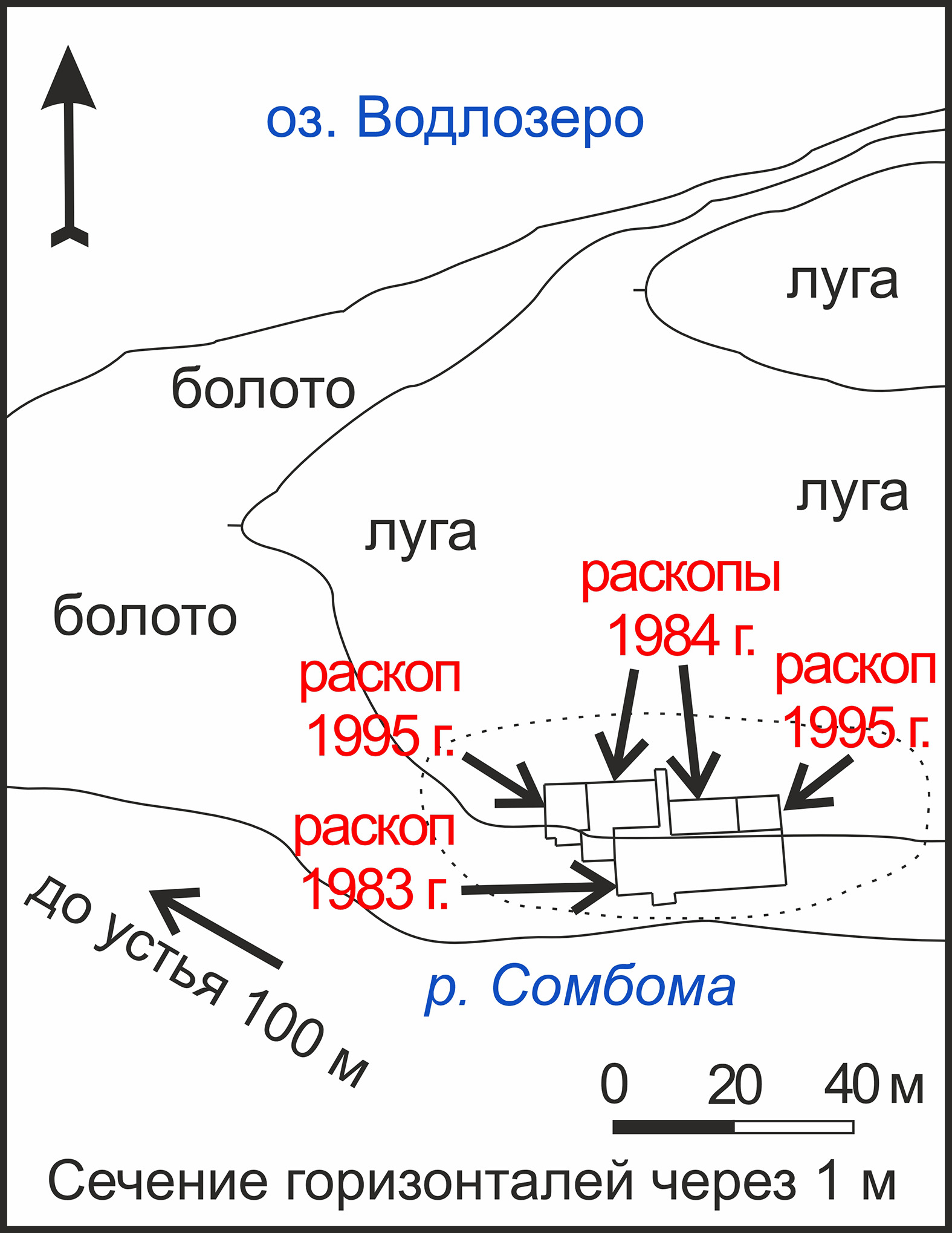 Рисунок 5 – Распределение керамики «каргопольского типа» и ямочно-гребенчатой в раскопах 1983, 1984, 1995 гг. на поселении Сомбома I