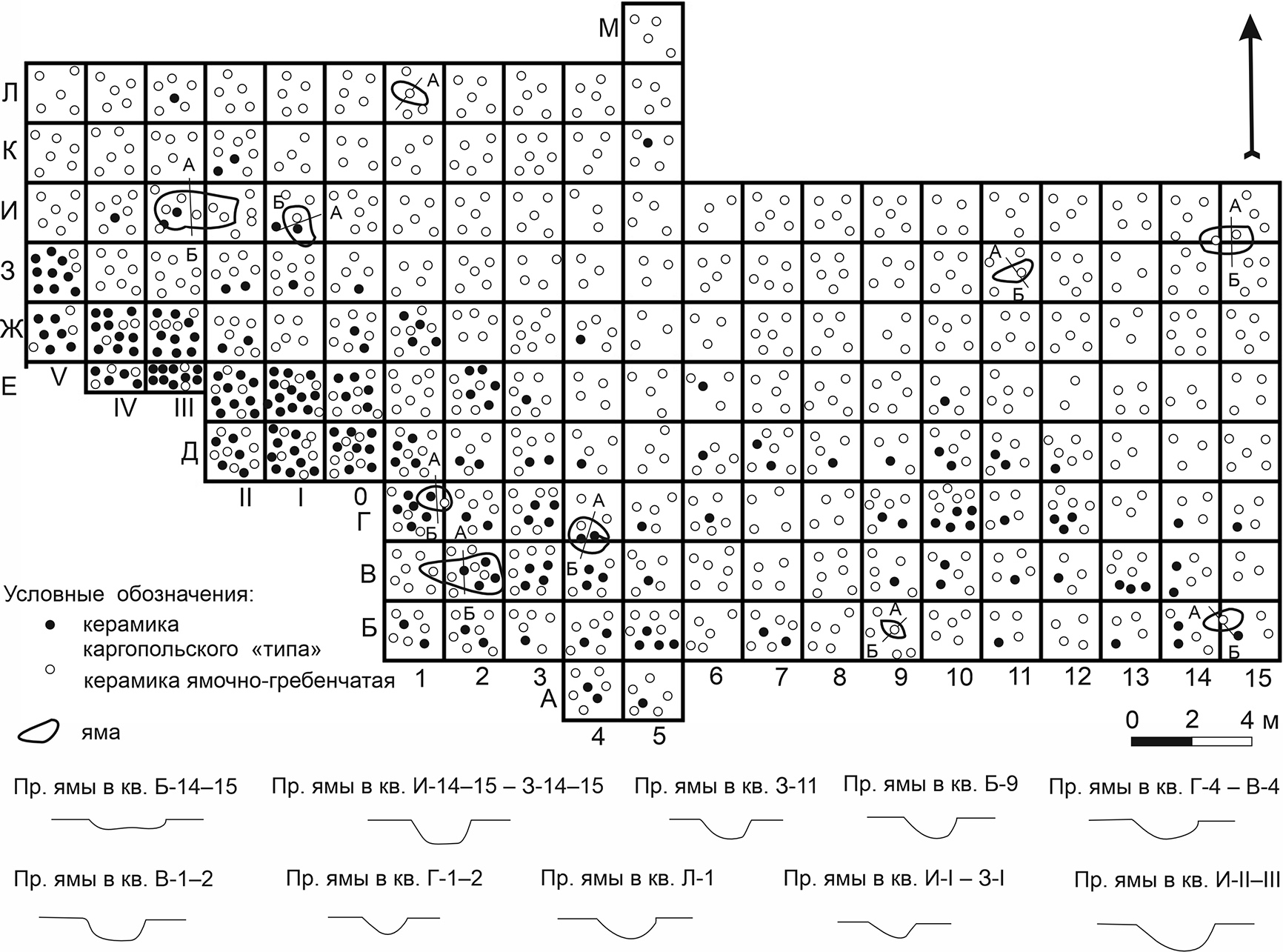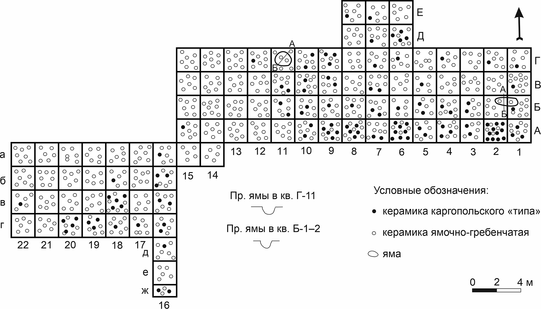 Рисунок 6 – Распределение керамики «каргопольского типа» и ямочно-гребенчатой в раскопах 1984–1985 гг. на поселении Охтома I