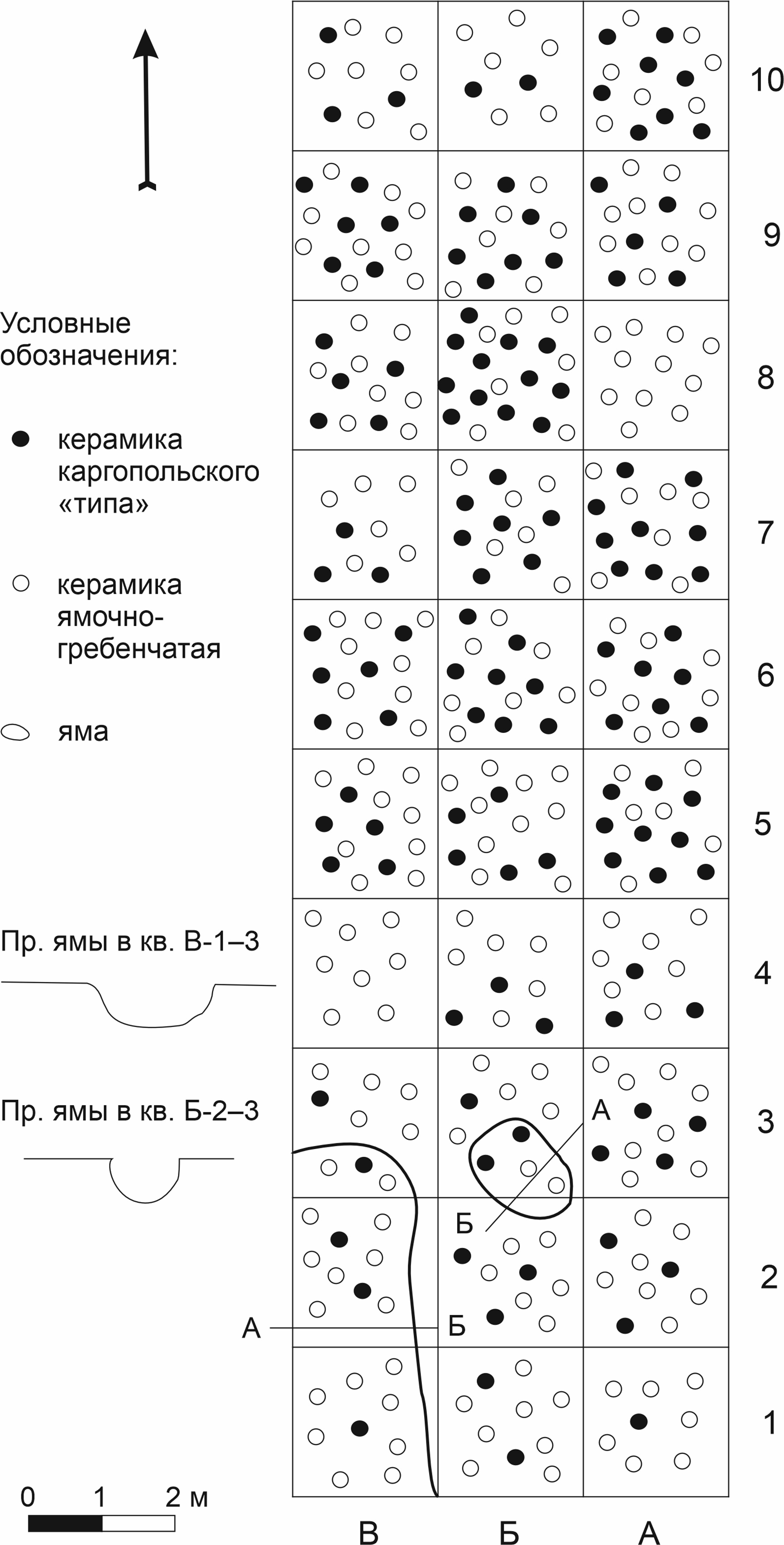 - – Яма в кв. Б-9 представляла собой углубление овальной формы, размеры 0,7 × 0,5 × 0,25 м, профиль котловидный. Заполнена темной супесью с примесью углей и кальцинированной костной трухой. Находки: фрагменты керамики ямочно-гребенчатой – 3, ромбоямочной – 2, позднекаргопольской – 1 [9, л. 27].