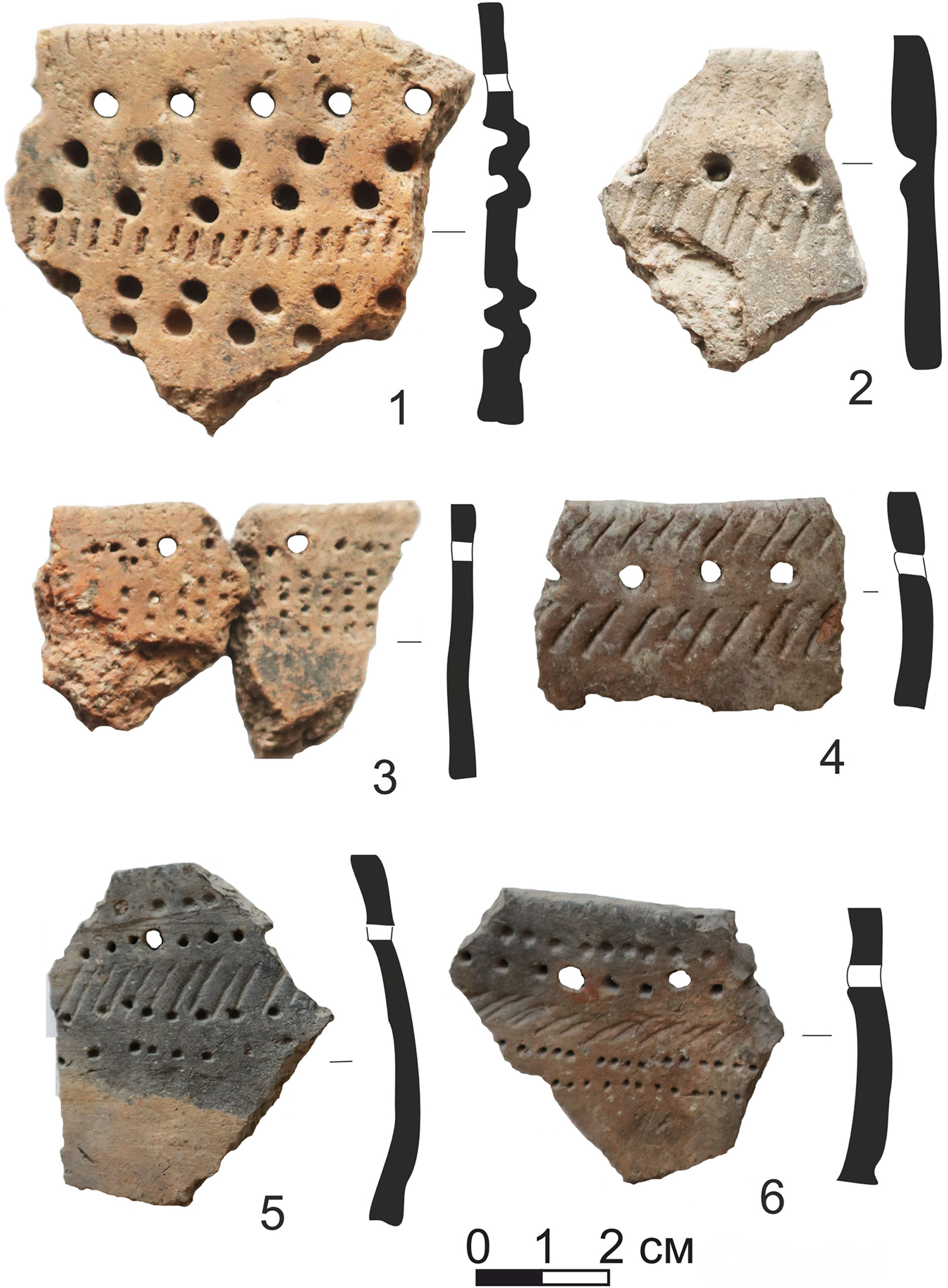 Рисунок 8 – Керамический материал поселений Сомбома I (1–3), Охтома I (4–6)