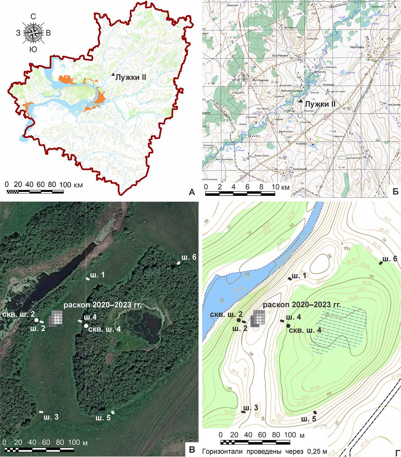 Район исследования расположен на территории Высокого Заволжья – возвышенной волнистой равнине, пересеченной глубокими речными долинами, балками и глубокими оврагами, в долине р. Сок (рис. 1). Русло реки сильно извилистое, средними шириной 25–35 м и глубиной 2–4 м. Преобладает скорость течения 0,2–0,4 м/сек, берега сложены песчаными, а в верховьях суглинистыми отложениями. Надпойменные террасы и пойма р. Сок покрыты породами неоген-четвертичного возраста, а водоразделы сложены породами татарского яруса пермской системы. На геоморфологической карте Самарской области в долине р. Сока выделяются: пойменная терраса, первая (хвалынская), вторая (хазарская) и третью (бакинская) надпойменные террасы. Пойма или пойменная терраса подразделяются на ступени: более низкая и молодая – формирующаяся или зачаточная пойма, следующая по высоте и возрасту – типичная и наиболее высокая – старая пойма [4]. Стоянка Лужки II расположена на вытянутом участке аллювиальной первой надпойменной террасы р. Сок между двумя старичными понижениями, примерно в 700 м от современного русла реки (рис. 1: В, Г). Ширина вытянутого участка составляет 60–90 м, длина – около 250 м. Старичные понижения представляют собой разновозрастные меандры р. Сок. Озеро 1 (предположительно более молодое) расположено ближе к современному руслу реки, к северо-западу от раскопа, имеет вытянутую форму, заболоченное, заросшее древесной и болотной растительностью и частично покрытое водой. Озеро 2 (предположительно более старое) расположено к юго-востоку от памятника, имеет овальную форму, заболоченное, не имеет водного зеркала и полностью заросло древесной растительностью. Неолитическая стоянка находилась между этими двумя старичными водоемами.