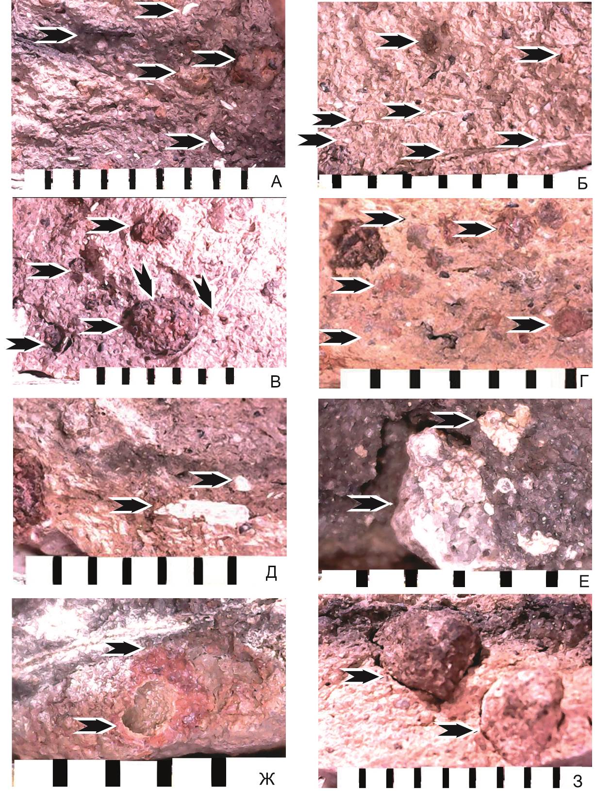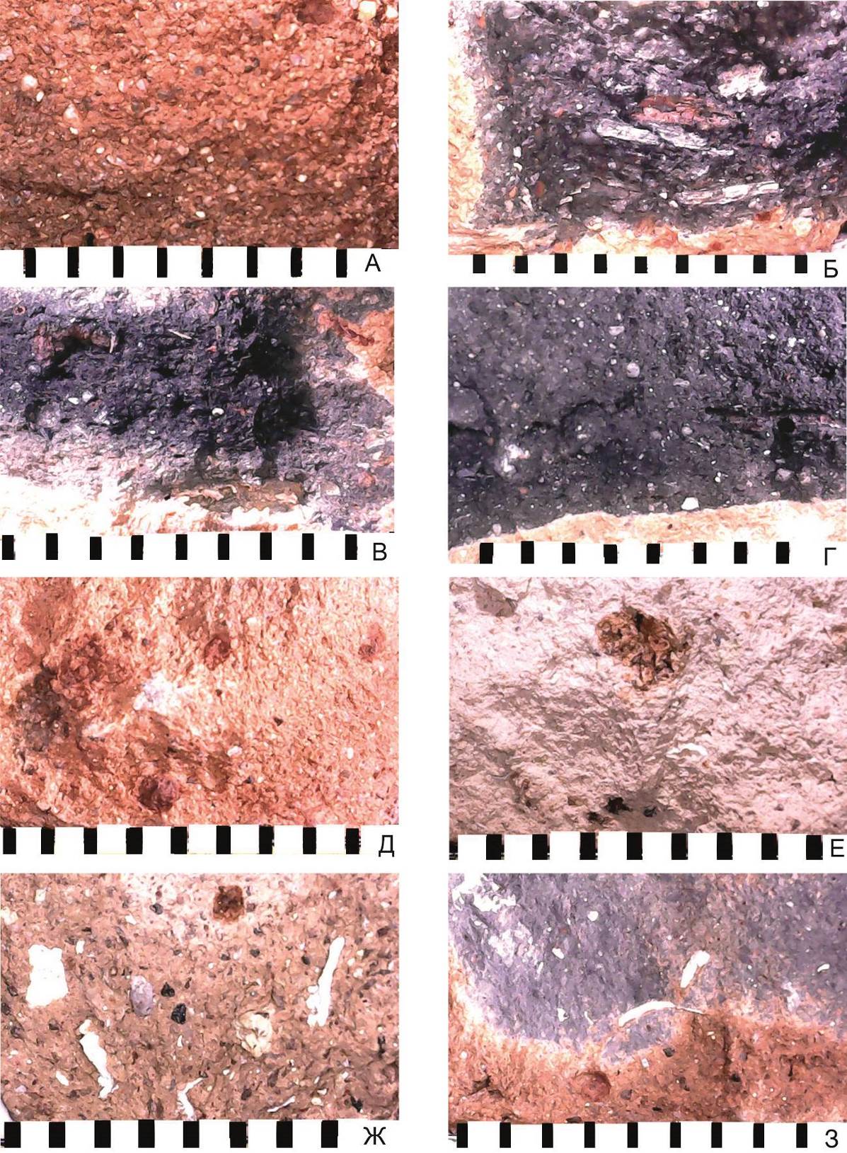 Рисунок 2 – Микрофотосъемка изломов керамики стоянки Лужки II. А–Б – органические и минеральные компоненты пластичного сырья; В–Г – железистые и глинистые комочки; Д – обломки раковин пресноводных моллюсков; Е – карбонатные включения; Ж – железистые трубочки; З – оолитовый бурый железняк