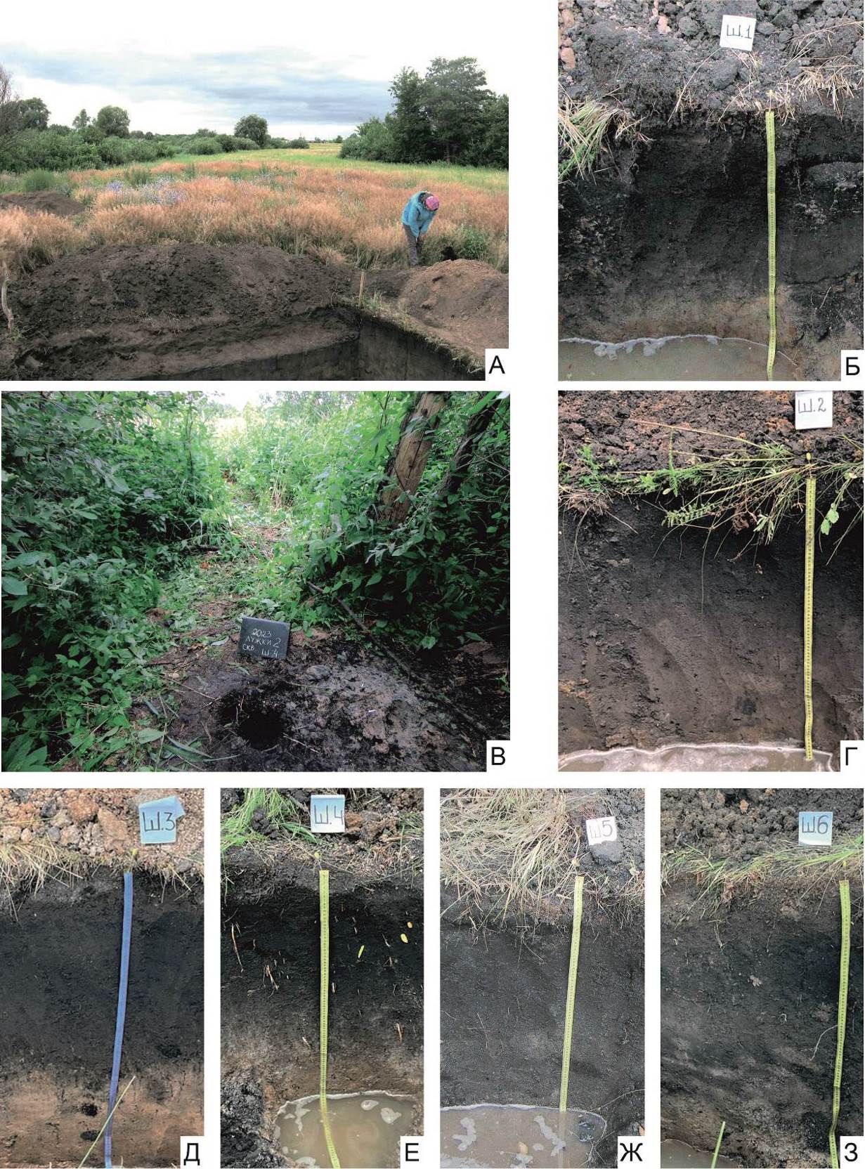 Рисунок 4 – Стоянка Лужки II. А – общий вид с севера, на переднем плане – раскоп 2023 г.; Б – почвенный разрез 1; В – скважина 2; Г – почвенный разрез 2; Д – почвенный разрез 3; Е – почвенный разрез 4; Ж – почвенный разрез 5; З – почвенный разрез 6