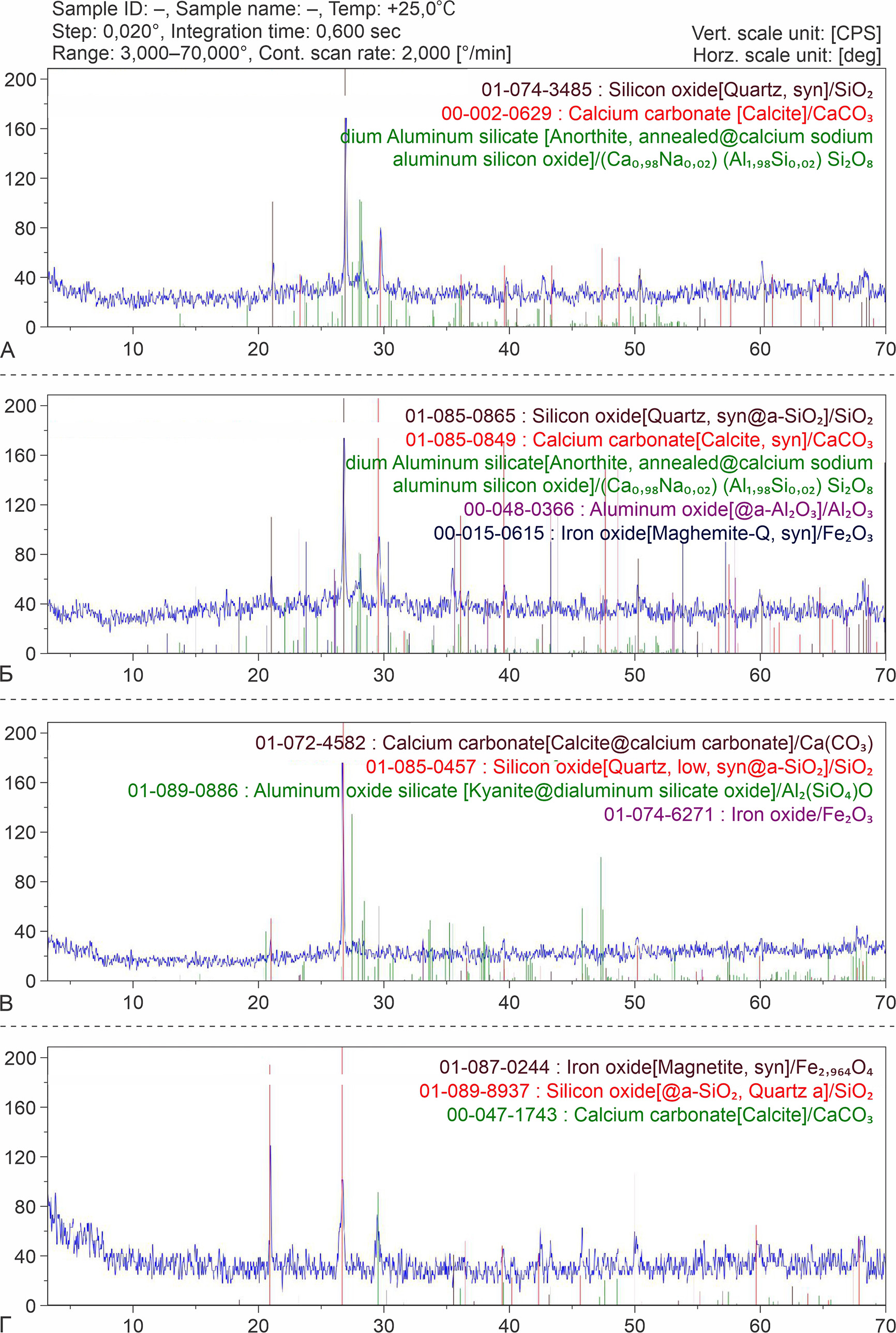 Рисунок 5 – Результаты рентгенофазового анализа (РФА). А – образец 1, керамика, развал сосуда № 215 (2022); Б – образец 2, керамика, развал сосуда № 280 (2022); В – образец 3, эталон из обожженной глины, скважина 1, гл. 0–20 см; Г – образец 4, эталон из обожженной глины, шурф 1, гл. 42–60 см