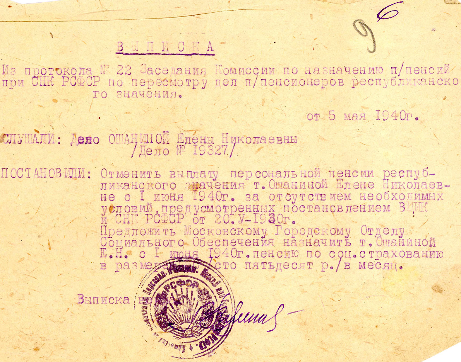 Решением Президиума ЦИК СССР от 25 июня 1935 г. Общество политкаторжан и ссыльнопоселенцев было ликвидировано, поэтому информация в деле Елены Николаевны Ошаниной обрывается. В 1935–1940 гг. Елена Николаевна являлась персональной пенсионеркой РСФСР, а в июне 1940 г. была переведена с персональной пенсии на пенсию по социальному страхованию [13, л. 4 об.; 14, л. 9–10] (рис. 2, 3).