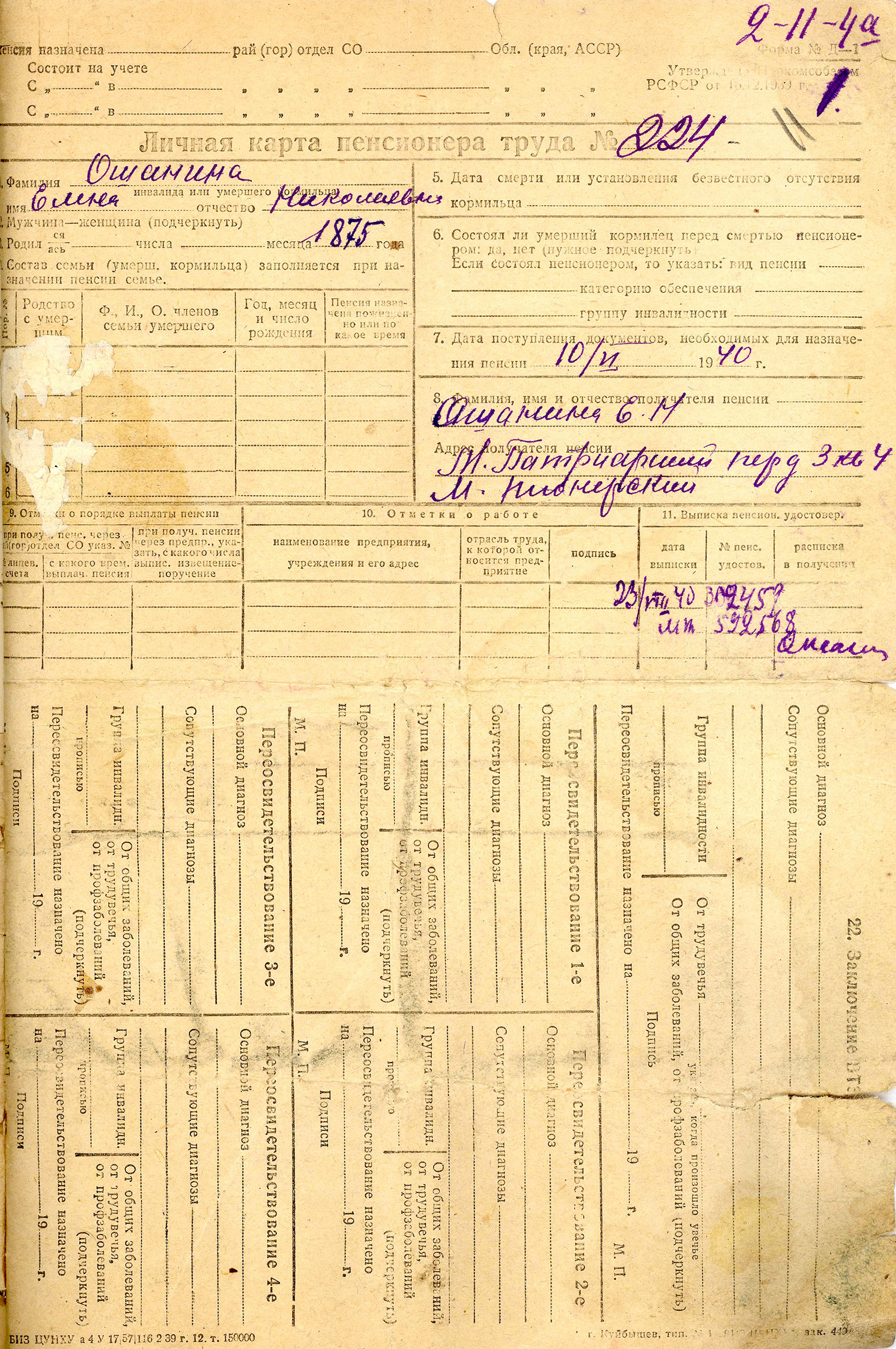 Рисунок 3 – Личная карта пенсионера труда [14, л. 11а]