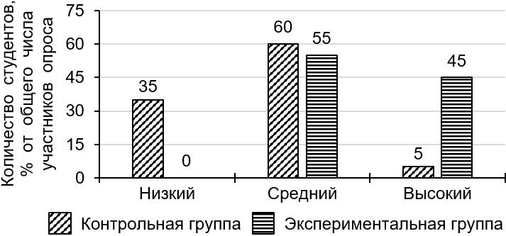 Результаты опроса показали, что у студентов контрольной группы познавательный интерес к естествознанию находится в основном на низком или среднем уровне, в то же время в экспериментальной группе низкий уровень не был зафиксирован вообще, а значительная часть студентов (45%) продемонстрировала высокий уровень познавательного интереса (рис. 2).