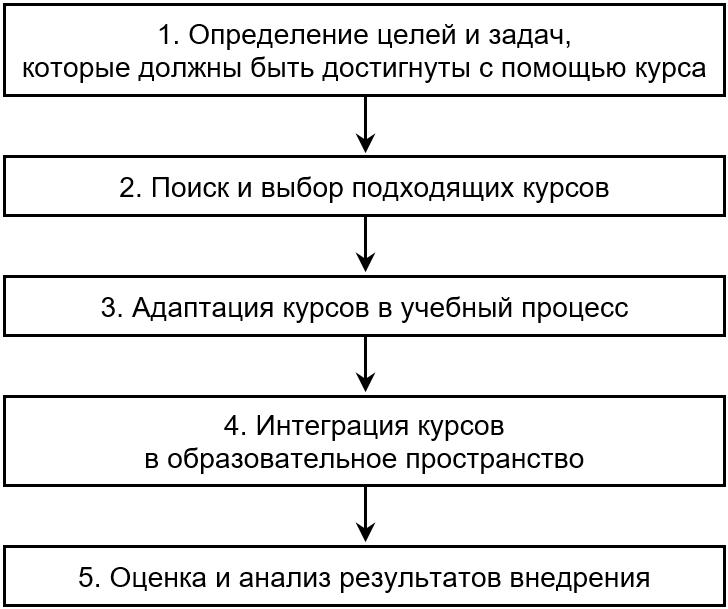 - Интеграция курсов в учебный процесс. После адаптации курсов к программе вуза начинается их интеграция в образовательное пространство. Они могут использоваться как дополнительный материал, так и являться основой для создания собственного курса.