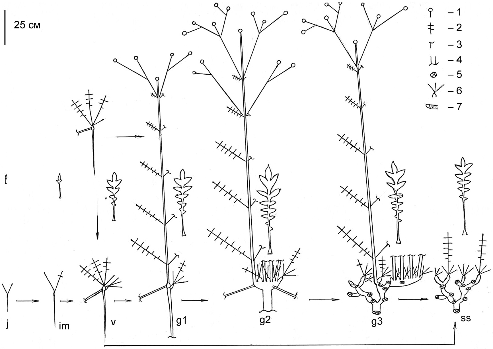Рисунок 1 – Онтогенез Chephalaria litvinovii в Пензенской области (1 – головка; 2 – лист (число чёрточек соответствует числу сегментов); 3 – супротивный лист узла; 4 – удлинённый генеративный побег; 5 – след на каудексе или каудикуле, оставленный отмершим побегом; 6 – розеточный побег; 7 – гипогеогенное корневище)