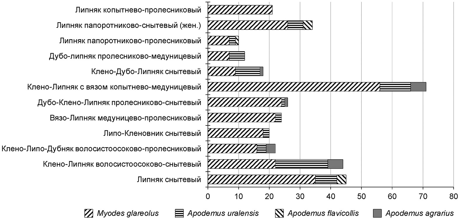 Наиболее оптимальными типами парцелл для лесных мышей является среднеувлажненные неморальные группировки с доминантами в нижнем ярусе из звездчатки ланцетолистной, ландыша, копытня, майника. Флуктуации оптимума по годам незначительны, что говорит о большей специализации лесных мышей в выборе типа растительности [12].