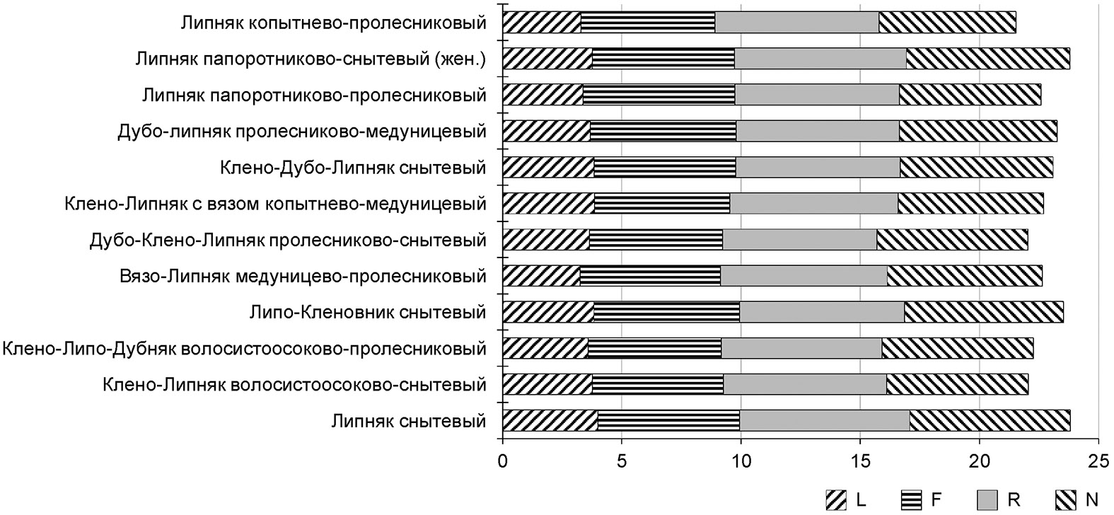 По основным факторам – освещенность L, влажность F, закисленность почв R и богатство почвы азотом N – пробные площади распределились следующим образом (рис. 3).