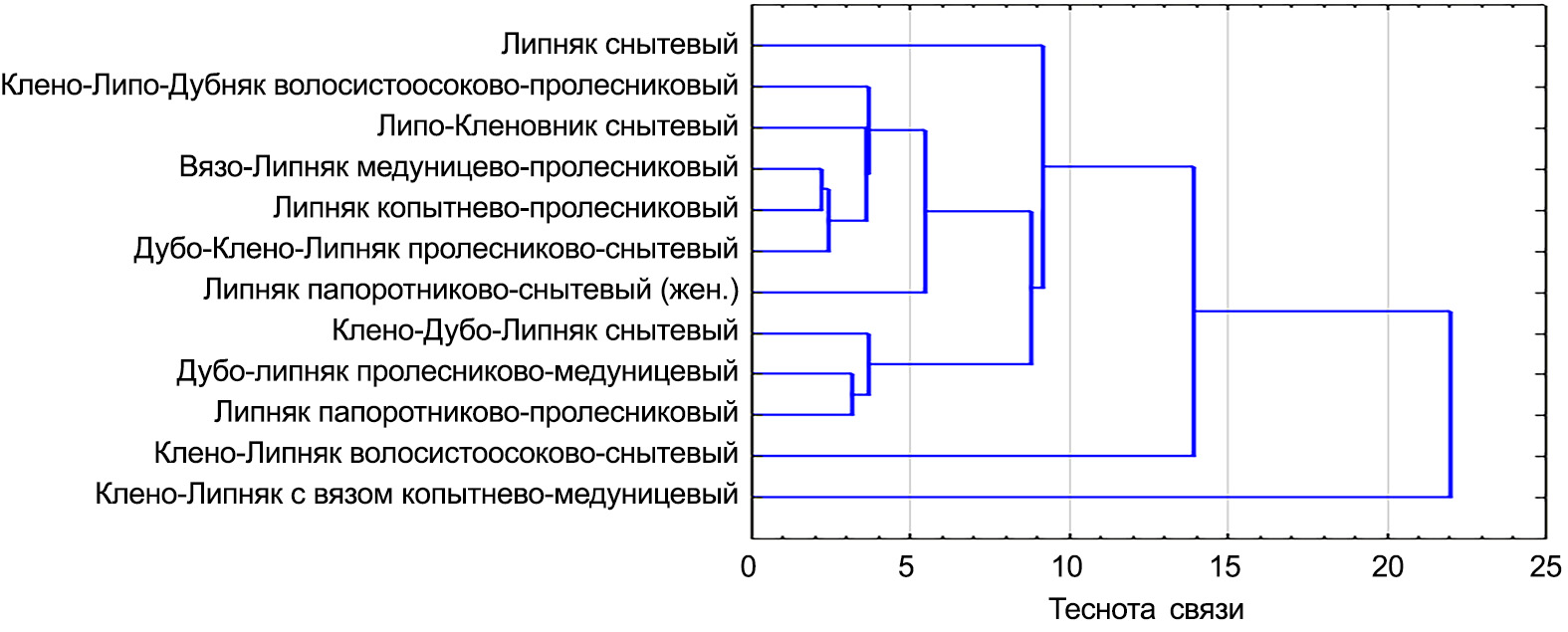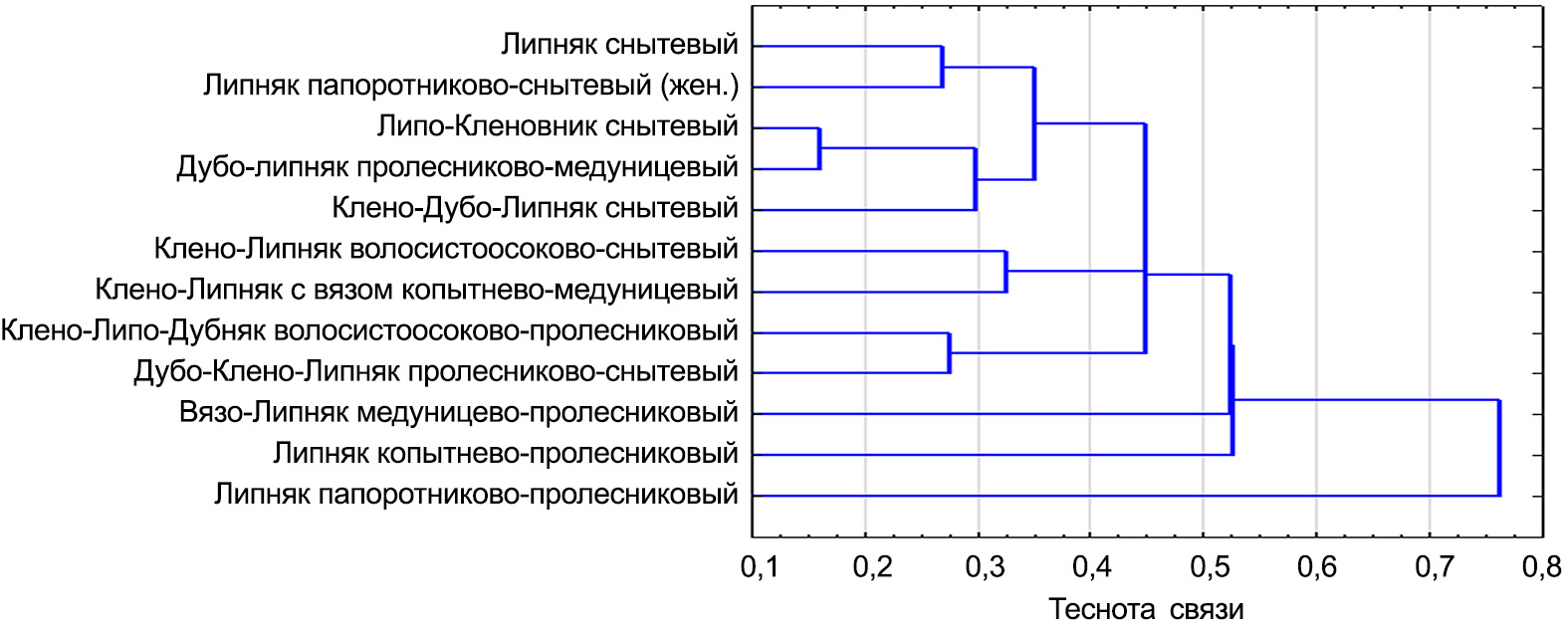 Наименьшее сходство с другими растительными ассоциациями демонстрирует Липняк папоротниково-пролесниковый. Также особняком на диаграмме располагаются Липняк копытнево-пролесниковый и Вязо-Липняк медуницево-пролесниковый. Для Липняков копытнево-пролесникового и папоротниково-пролесникового отмечены низкие показатели освещенности и богатства азотом. Вязо-Липняк медуницево-пролесниковый, помимо низкого показателя освещенности, характеризуется нормальным pH почвы в сочетании со средним показателем богатства азотом.