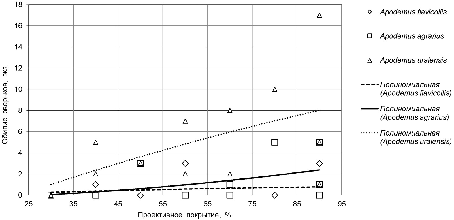 Большее значение для микротинных грызунов, на наш взгляд, должна иметь структура растительного покрова и его проективное покрытие. Используя данные по численности и плотности мелких млекопитающих и проективному покрытию травяно-кустарничкового яруса, построены диаграммы рассеяния для трех видов рода Apodemus (рис. 5). Рыжая полевка как более экологически пластичный вид из анализа была исключена.
