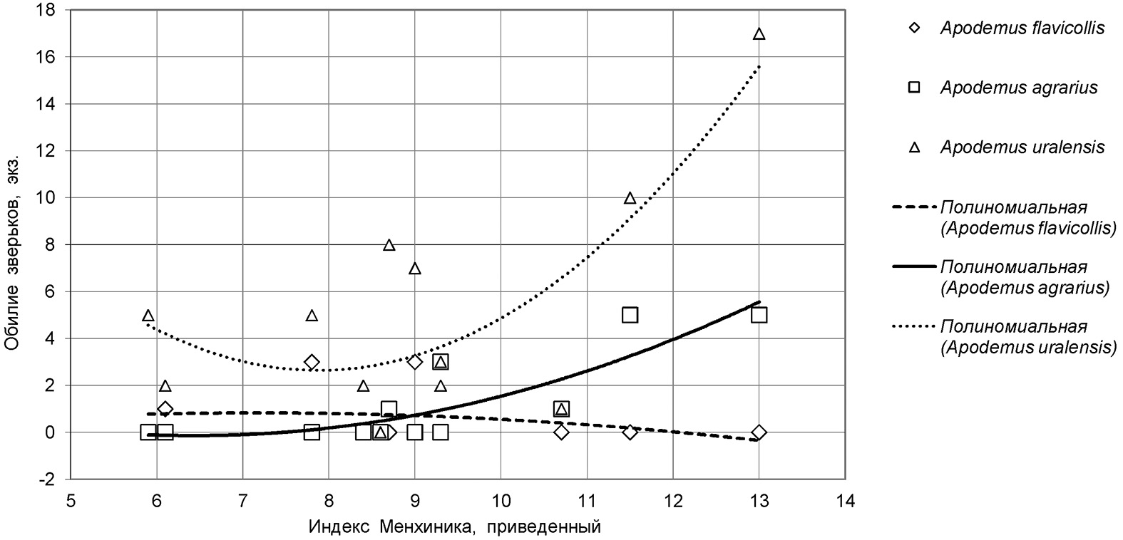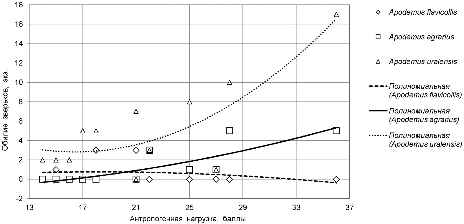 Таким образом, использование видов Apodemus agrarius и Apodemus flavicollis в качестве показателей антропогенного пресса, на наш взгляд, весьма неоднозначно и требует дальнейшего изучения.