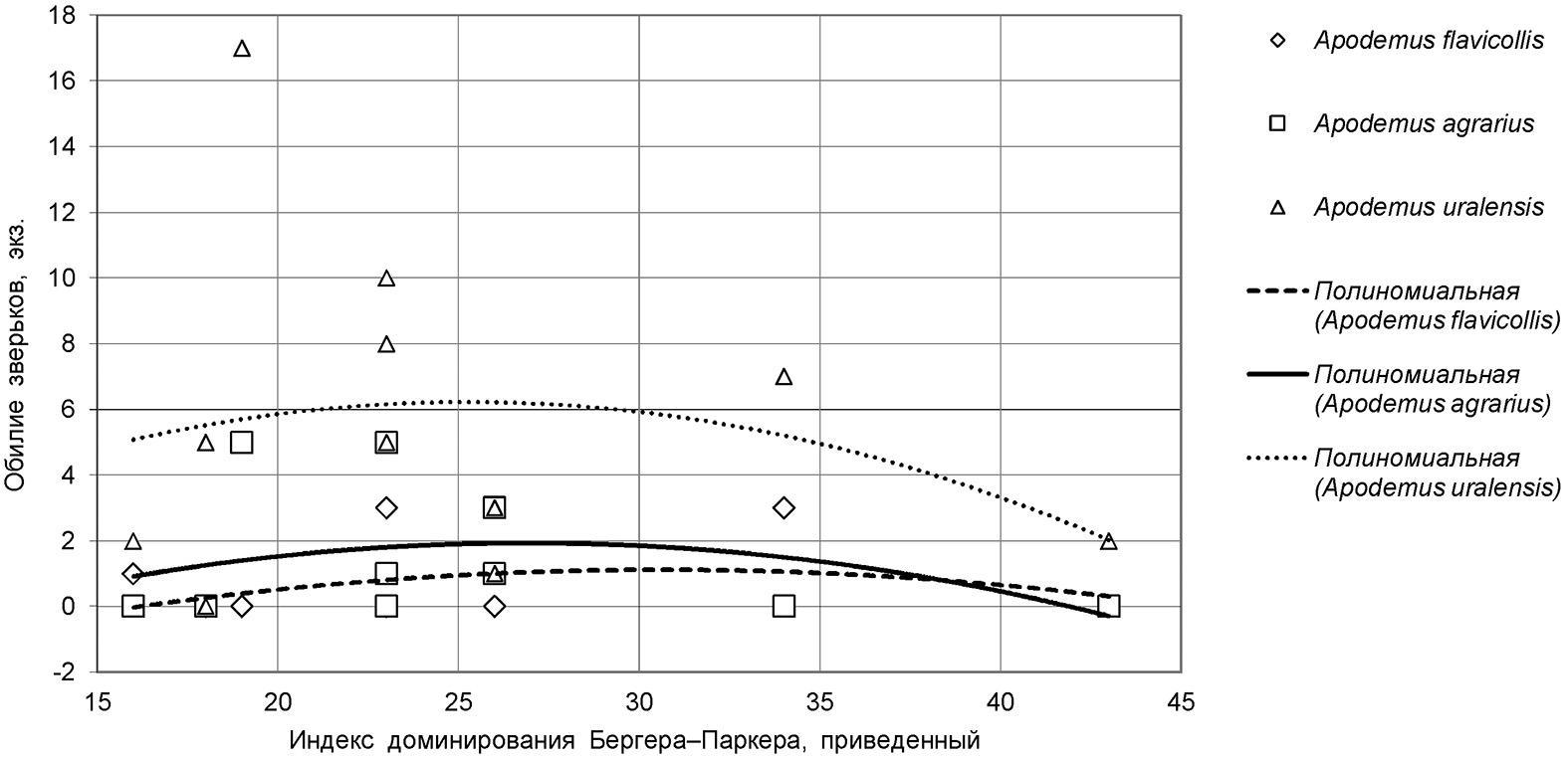 Рисунок 8 – Диаграмма рассеяния для видов рода Apodemus в зависимости от индекса доминирования Бергера–Паркера для растительного покрова