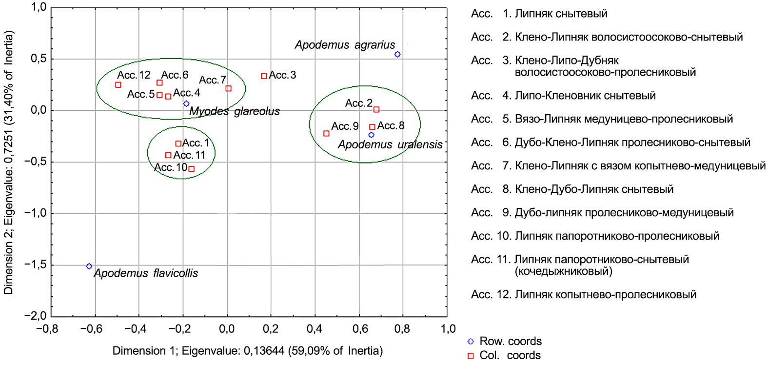 Точки, соответствующие видам желтогорлая и полевая мыши, расположены особняком. Это говорит о том, что зверьки немногочисленны в условиях данных ассоциаций. Кроме того, Apodemus agrarius, скорее всего, демонстрирует исходную сопряженность со старовозрастными лесами, маркером которых является Viola mirabilis, проявляя черты стенобионтности.