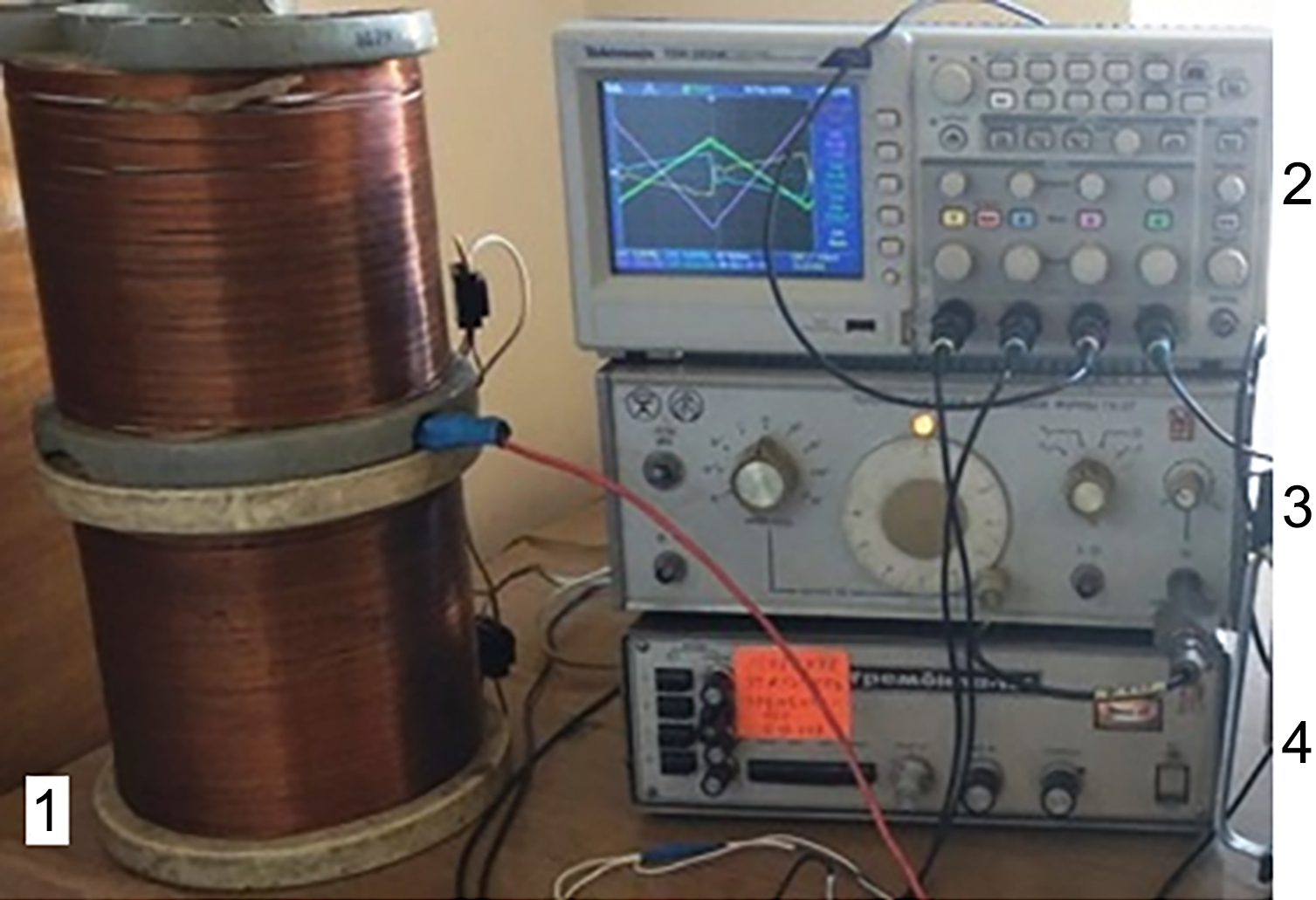 Рисунок 1 – Внешний вид устройства по обработке семян кукурузы сахарной переменным магнитным полем. Обозначения: 1 – две катушки; 2 – осциллограф; 3 – генератор сигналов специальной формы Г6 28; 4 – источник тока с высоким выходным сопротивлением (ИТУН), работающий в ключевом режиме