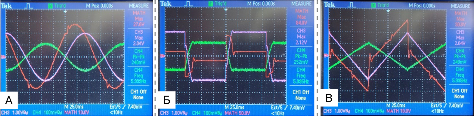 Рисунок 2 – Форма сигнала, используемая в экспериментальной установке по обработке семян кукурузы сахарной переменным магнитным полем (фото с осциллографа). Примечания: А – синусоидальный ток, текущий через катушку; Б – ток через катушку в устройстве меняется скачком (форма входного сигнала – меандр); В – линейно изменяющийся ток через катушку (треугольная форма сигнала)
