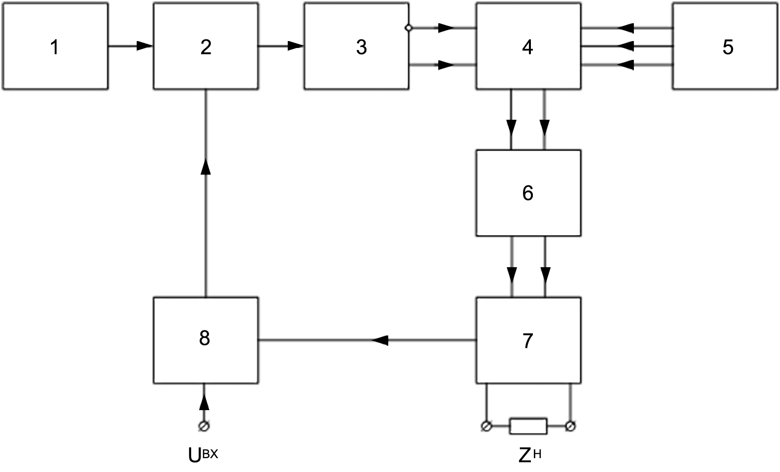 Рисунок 3 – Блок-схема устройства источника тока управляемого напряжением. Обозначения: 1 – формирователь треугольного напряжения; 2 – вход компаратора; 3 – вход формирователя сигналов управления (ФСУ); 4 – затворы мощных полевых транзисторов выходного каскада; 5 – блок питания; 6 – выходной LC фильтр; 7 – датчик, который формирует на выходе сигнал, пропорциональный току, текущему через нагрузку ZН; 8 – регулирующий усилитель